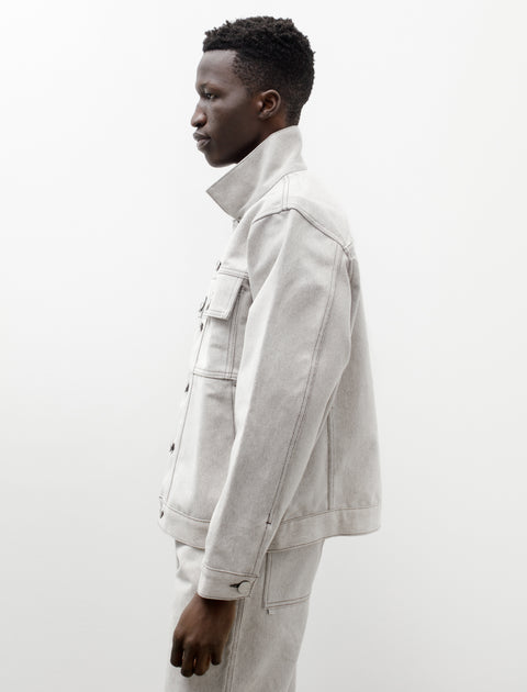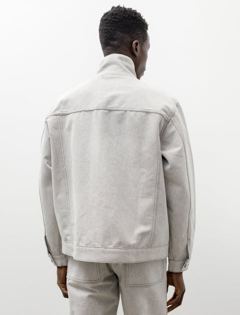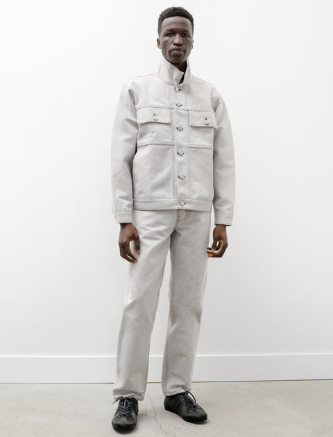 A wide fitting, boxy, trucker jacket cut from a super dense, heavyweight cotton canvas in salt and pepper. Unique surface texture and colour is achieved by mixing white warp yarns with black weft to create a kind of matte iridescence. Features a tack button front closure, patch pockets at the front yoke with tack button flap closure, and side entry, rivet reinforced waist pockets. Constructed using chain stitched, flat felled seams for maximum durability.