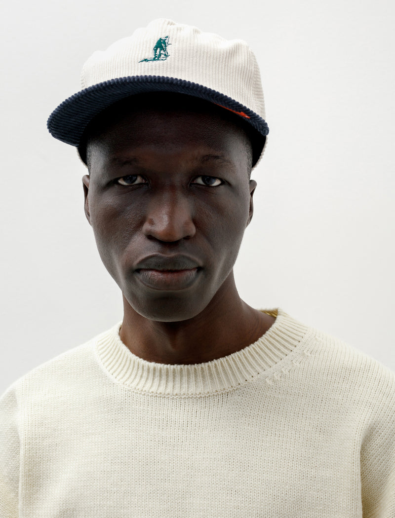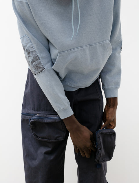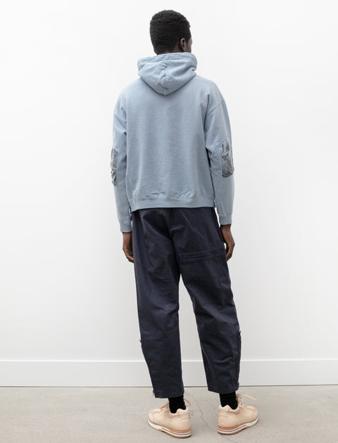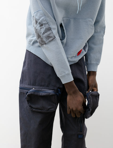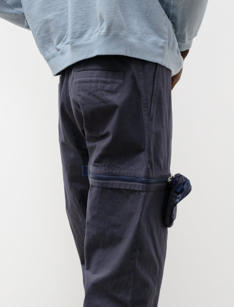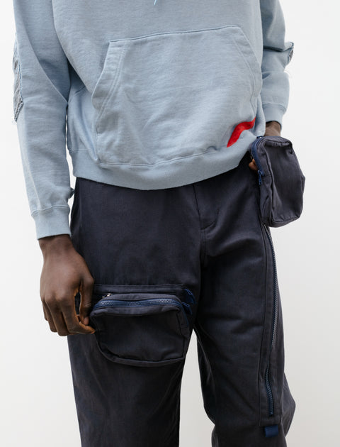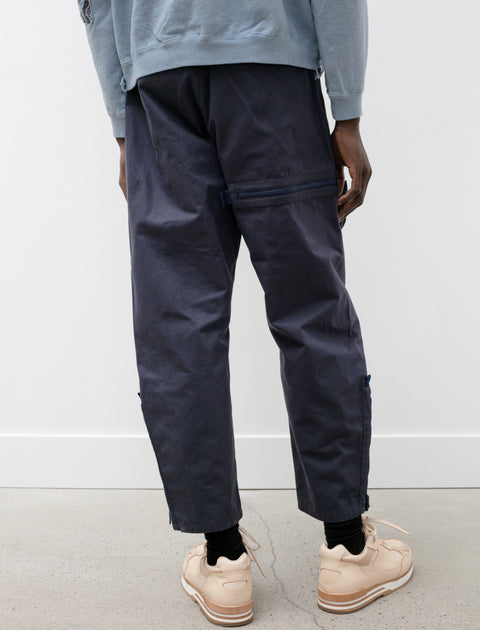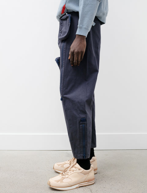 Relaxed fitting long rise cargo pants cut from a dense, lightweight nylon canvas in a dusty navy blue. Feature a zip fly with concealed snap closure, an internal drawstring, and classic four pocket styling. Unique shape achieved using a two-piece construction without a side seam and zipped vent pleats at the ankle for a tapered technical look. Finished with two asymmetric, three-dimensional patch pockets that slide either up and down or side to side on an inventive zipper mechanism at the thigh.