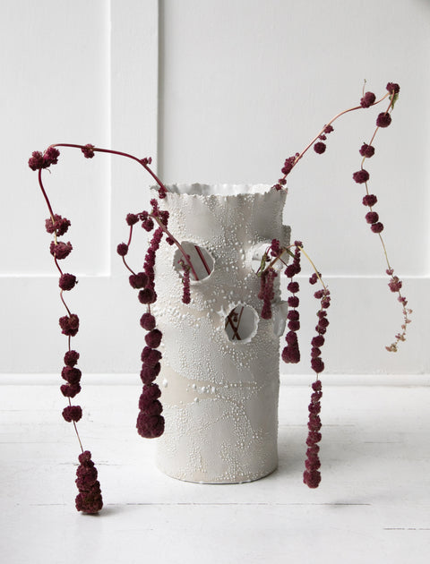 A tall version of Nathalee’s Roosting Vase, this vessel is perfect for large scale arrangements. Flowers poke their heads out of hand torn holes just like birds nesting in the trunk of a tree.