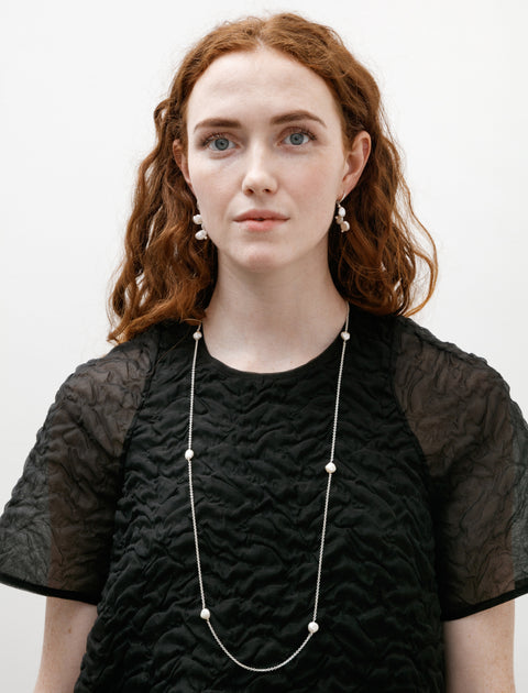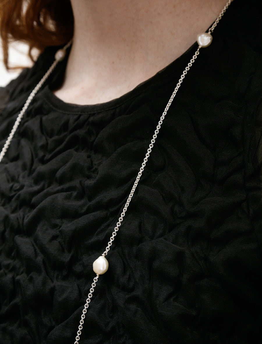Elegant and sophisticated, this long necklace from Santangelo immediately elevates any look. The long sterling silver chain is complete with freshwater keshi pearls placed intentionally spaced out for a unique look. Handmade in New York using natural materials, no two pieces are exactly alike.