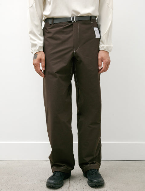 Relaxed fitting hiking pants cut from a water repellent, two-way stretch technical nylon plain weave in brown. Feature a zip fly with a top snap closure, a nylon webbing belt with a hook fastener, front slash pockets, zip closure rear pockets, and elastic drawcords at the hems. A generous crotch gusset and articulated pattern design through the leg create a dynamic active silhouette that can be further accented by cinching the hems for a slight balloon effect. Constructed with super low profile seam allowance and extremely light weight nylon ripstop pocket linings to maintain a smooth finish to minimize abrasion; contrast stitching in white throughout.