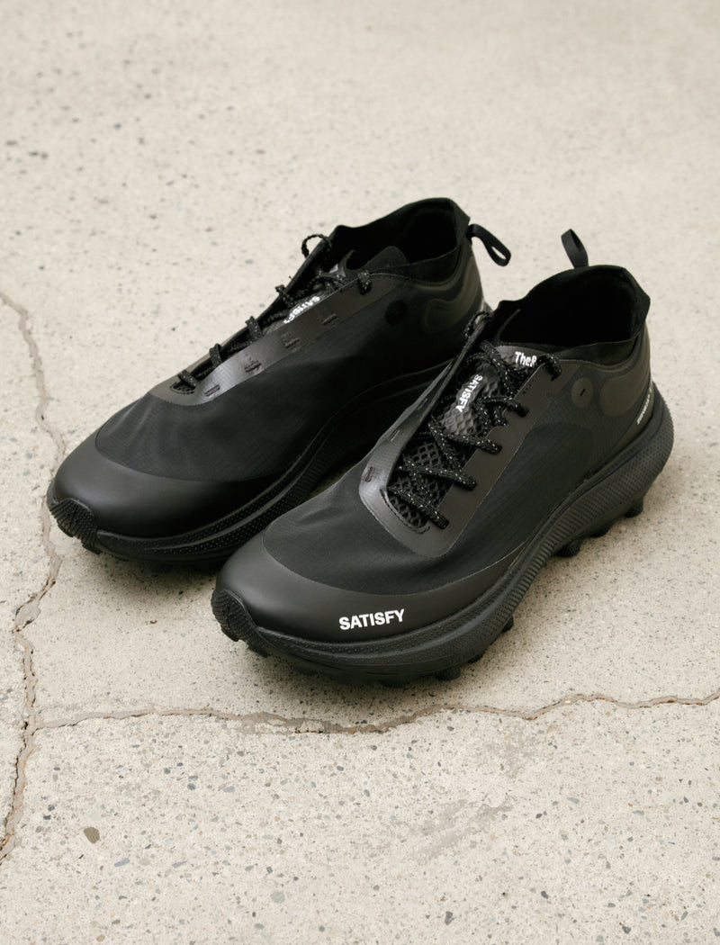 Airy, five-inch running shorts cut from a perforated, lightweight, technical stretch jersey in black. Feature Satisfy's signature two-layer waistband designed for storage of small valuables, and a minimal brief-style liner to add security to the roomy fit. The perforated finish allows for excellent air transfer, ensuring fast drying and rapid cooling while reducing abrasive surface volume as much as possible. Constructed using bonded seams and bonded hemming throughout for a smooth finish at the interior to maximize comfort; removable care label.
