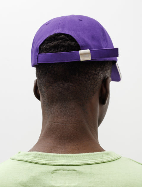 A classic six panel hat cut from a sturdy 10oz cotton canvas in purple. Features a contrast piping detail at the brim in white and a vented crown. Finished with a twill facing in black and black seam taping at the crown; buckle adjuster at the rear.