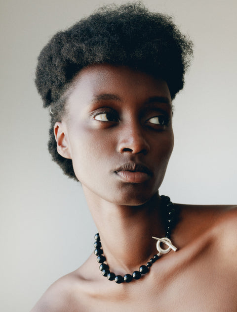 Bold onyx stones are strung together on a black silk thread to create a stunning collar that gives a cool, smooth feel against the skin. It’s signature sterling silver toggle clasp creates a bright contrast against the deep shine of the black.
