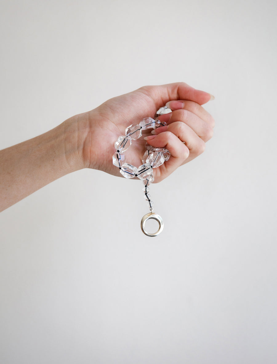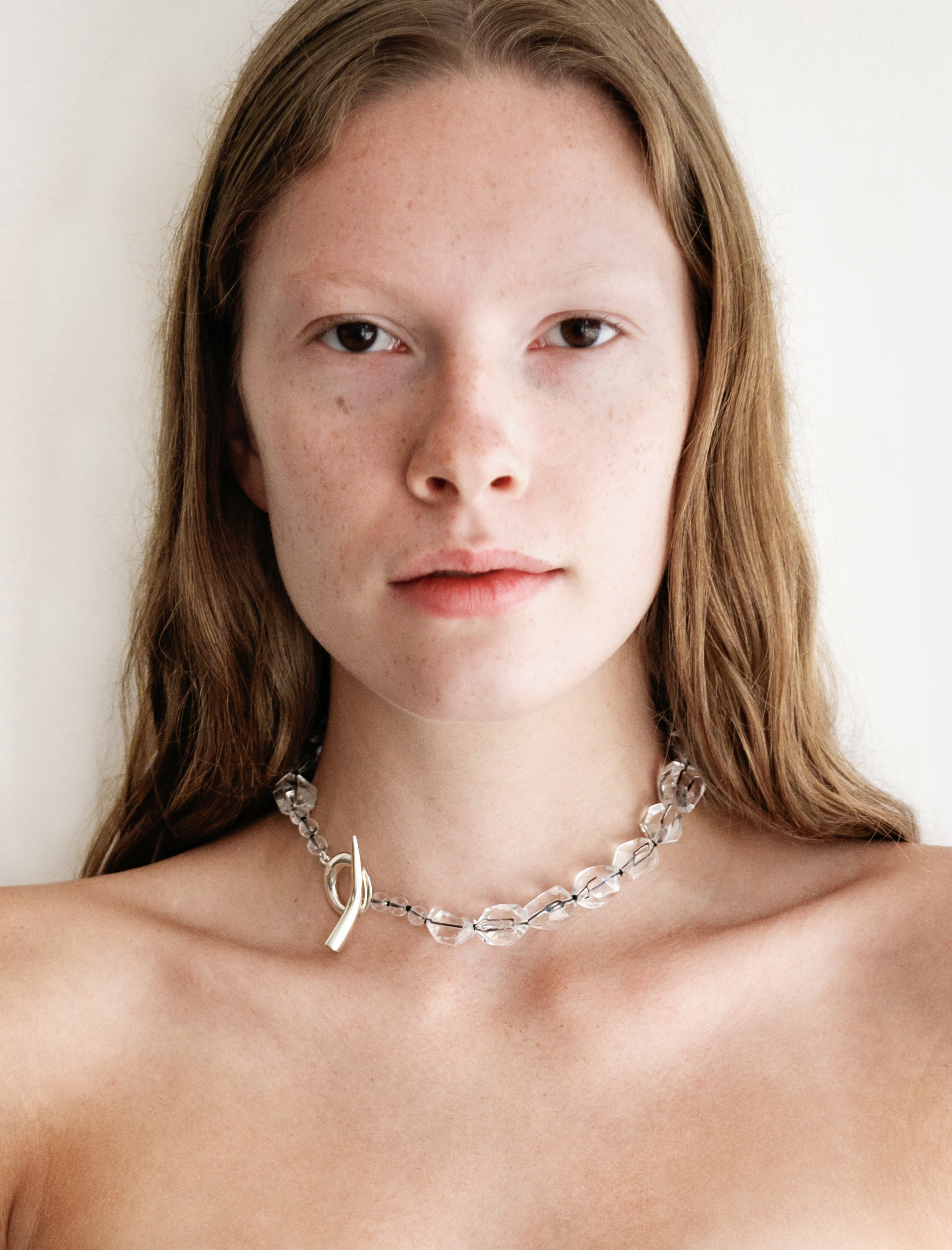 Simple yet bold, this collar-style necklace can seamlessly transition from casual to formal. Aptly named, this necklace is made of quartz stones in irregular, ice-like shapes strung onto a black silk cord with a sterling silver clasp.