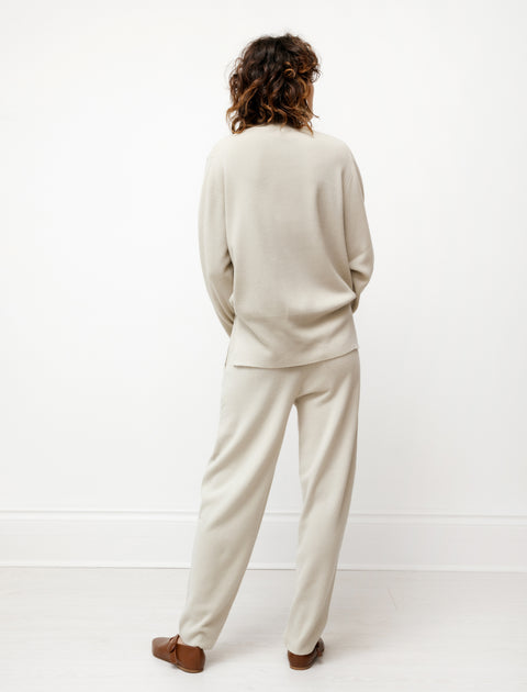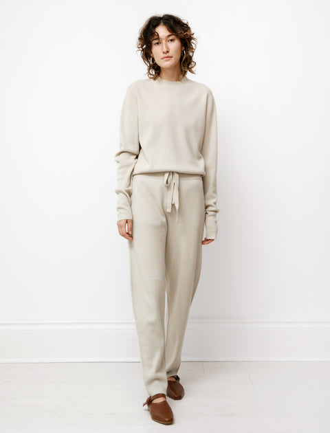 The dreamiest pants we can imagine wearing this season, knit from a merino-cashmere blend with a high rise, wide ribbed waistband and matching tonal drawstring. Their shape widens slightly towards the bottom, affording their draping leg a little more volume than most loungewear. Detailed with two welt pockets, once you’re in these pants you won't want to take them off.