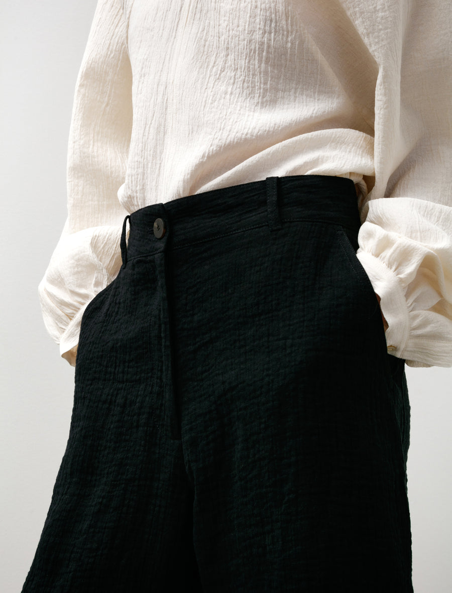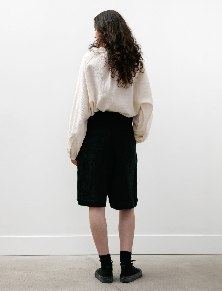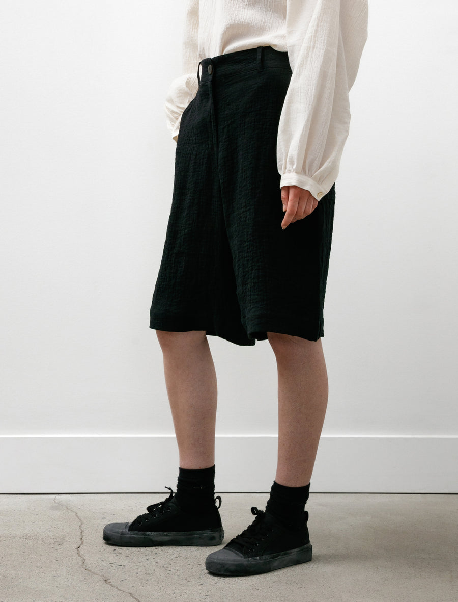 Relaxed yet tailored, these wide shorts from Studio Nicholson are a timeless wardrobe staple. Made from an Italian shrunk double linen in a deep navy colour, the fabric has been tumbled to create a textured, washed look. The high waist is complemented with a roomy fit through the leg for an easy-going feel that doesn't compromise sophistication. Complete with side pockets and back patch pockets, these shorts are the perfect versatile companion all summer long.