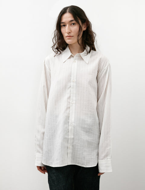 The most perfect button-up we ever did see. Made of a dry, matte Italian silk blend, it has an incredibly soft hand and a fluid drape. The silhouette is straight and subtly roomy with the tailored feel of a classic shirt without the stiffness. A pattern of thin black stripes on an ecru background adds a timeless and charming touch. Effortlessly versatile, this lightweight shirt can be worn buttoned or unbuttoned, to the office or on a casual stroll, wherever your day may bring you.