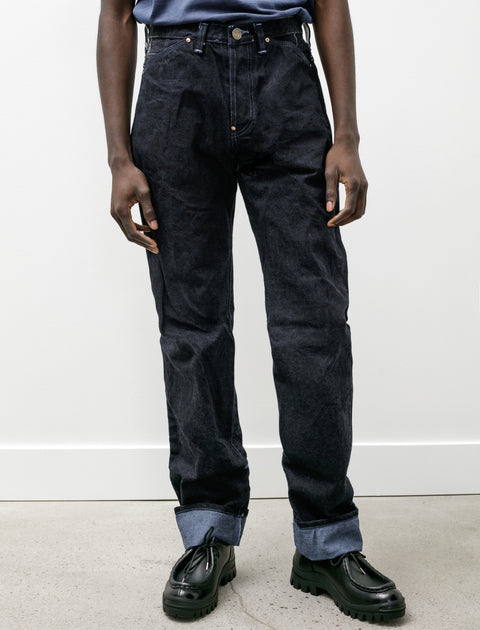 Straight cut, relaxed fitting jeans cut from a heavy sixteen-ounce denim that has been overdyed with natural indigo in Kojima, Japan. During the overdyeing process, the corners of the jeans are suspended while the rest of the pair is submerged in the dye bath giving a subtle contrast and making reference to the Greek myth of Achilles. Thanks to Tender’s signature hyper durability, notable details include a rivet reinforced button fly, rivet reinforced pockets, six bar-tacked belt loops, and flat felled seams through the seat. Outseam cut on selvedge for a long lasting, highly stable edge finish; super durable tack button attached with no-slip brass pin.
