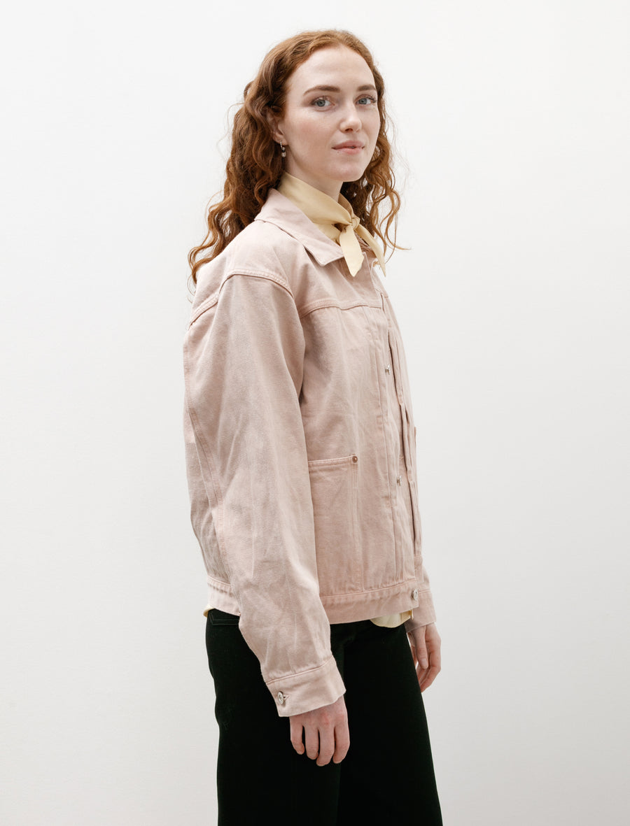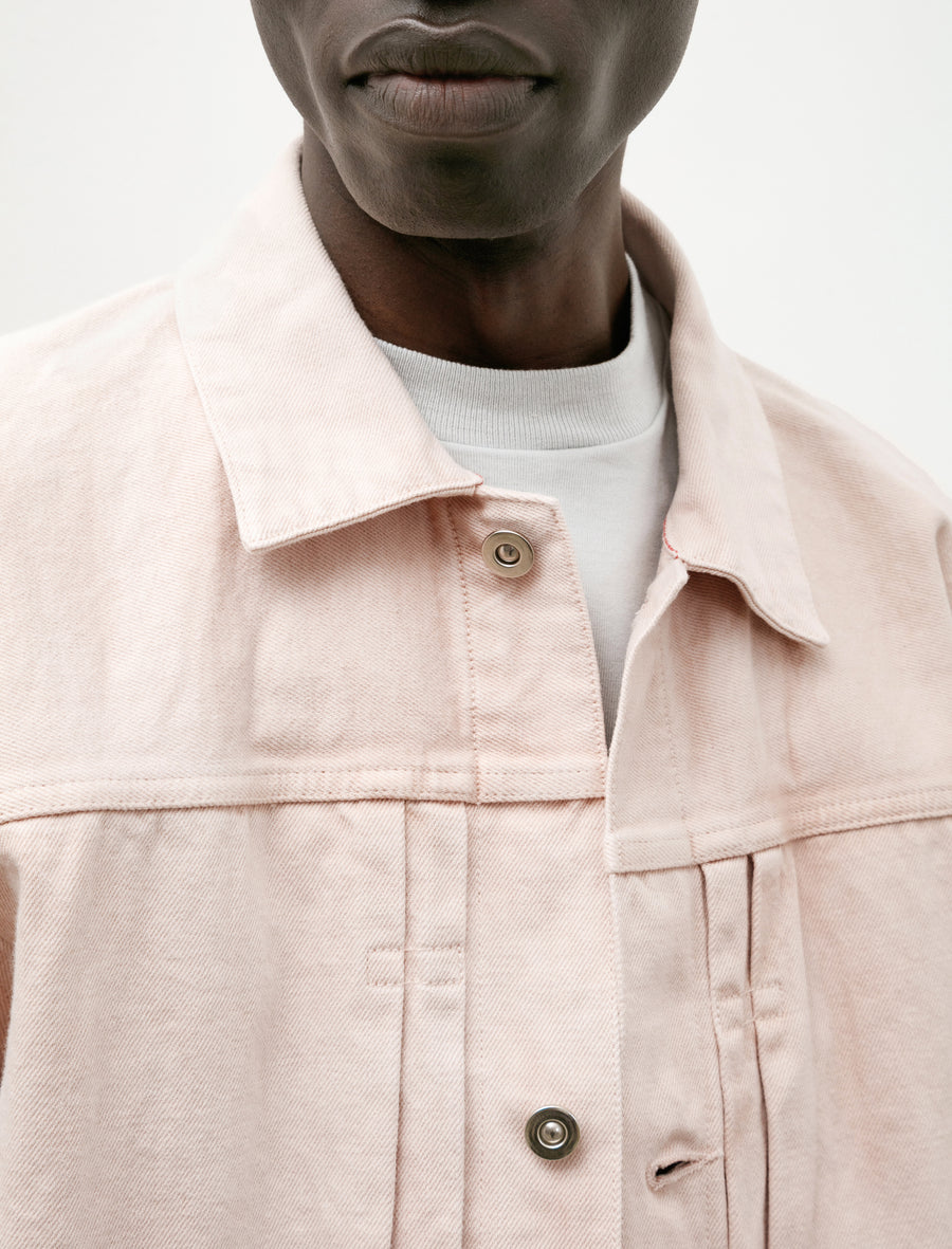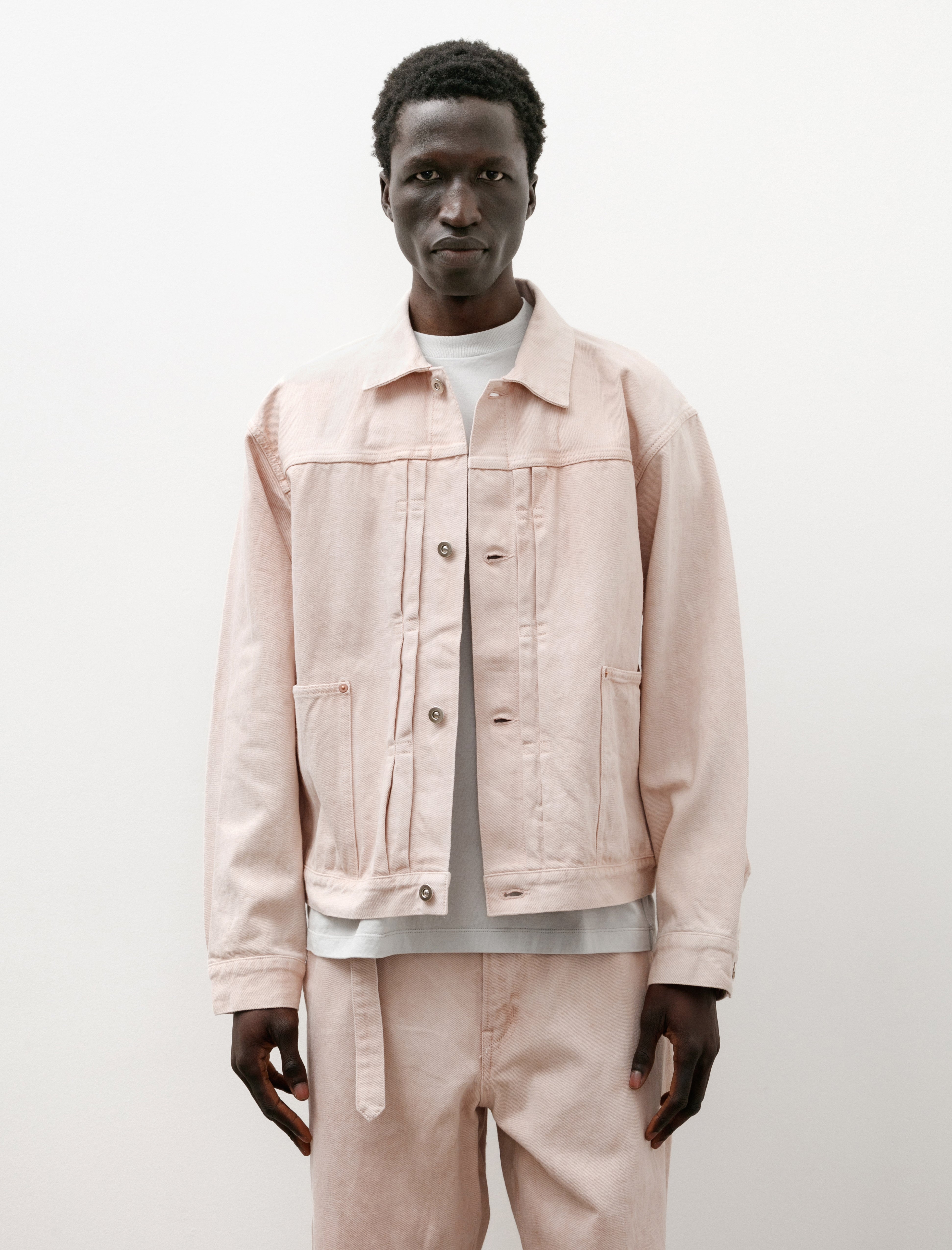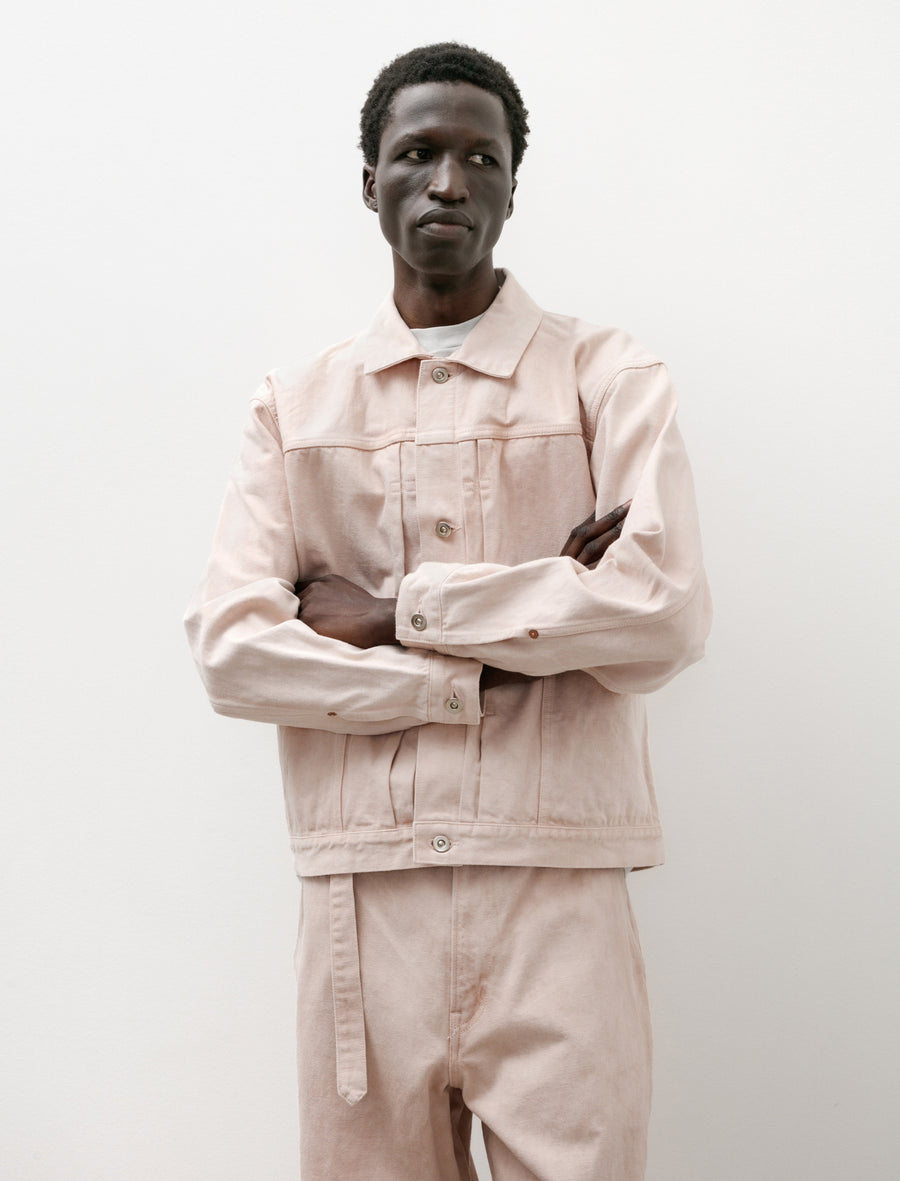 A relaxed fitting, cropped, blouson jacket cut from a high density cotton denim woven on shuttle looms that has been naturally dyed to a soft shade of blush pink using chestnut extract. Features a classic collar, a pleated front, patch pockets at the waist, and engineer's cuffs. Pleats along the back shoulder and waist enhance the already tapered profile to produce a sense of dynamic volume while high armholes and well-cut sleeves prevent the silhouette from appearing excessively large. Constructed using flat felled seams throughout and selvedge cut detailing for a hard wearing finish; tack buttons throughout, rivet reinforcement at high stress points throughout.