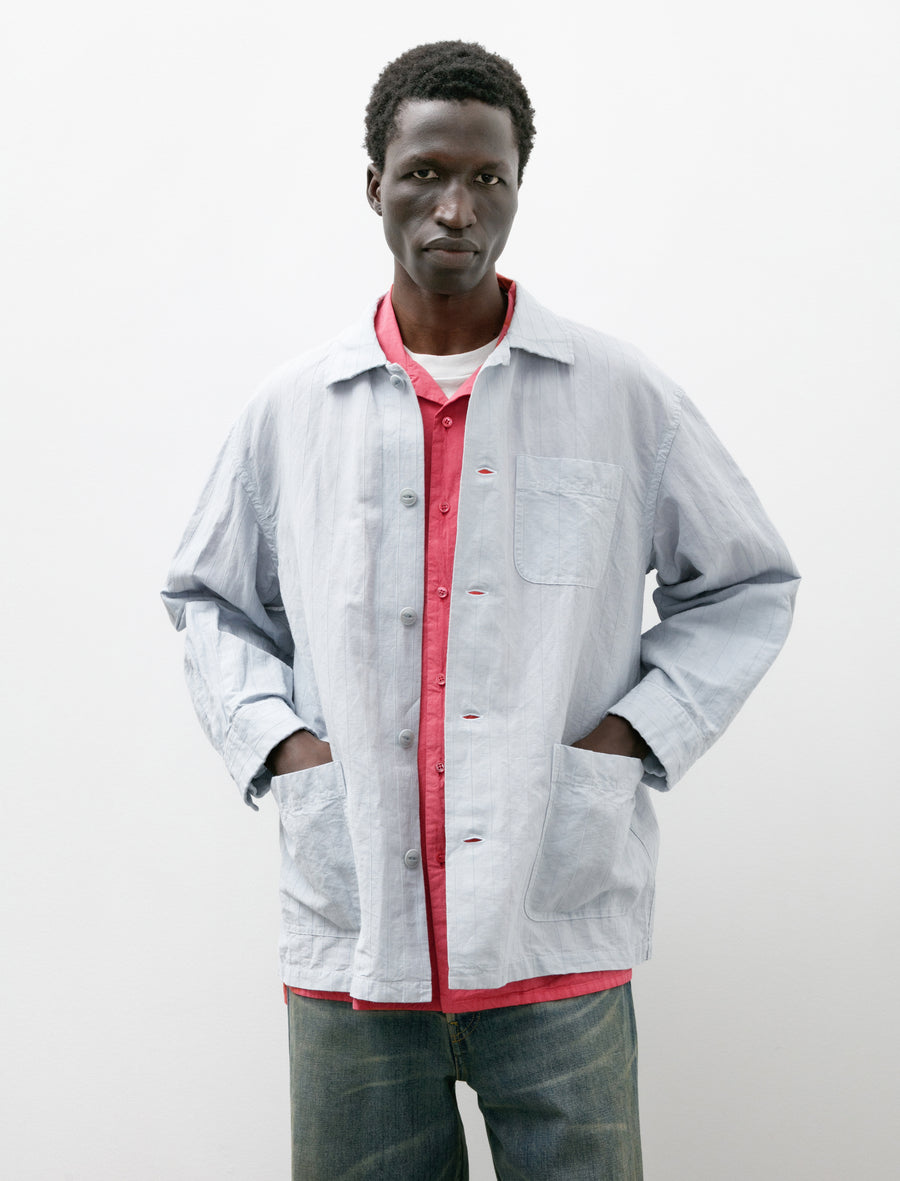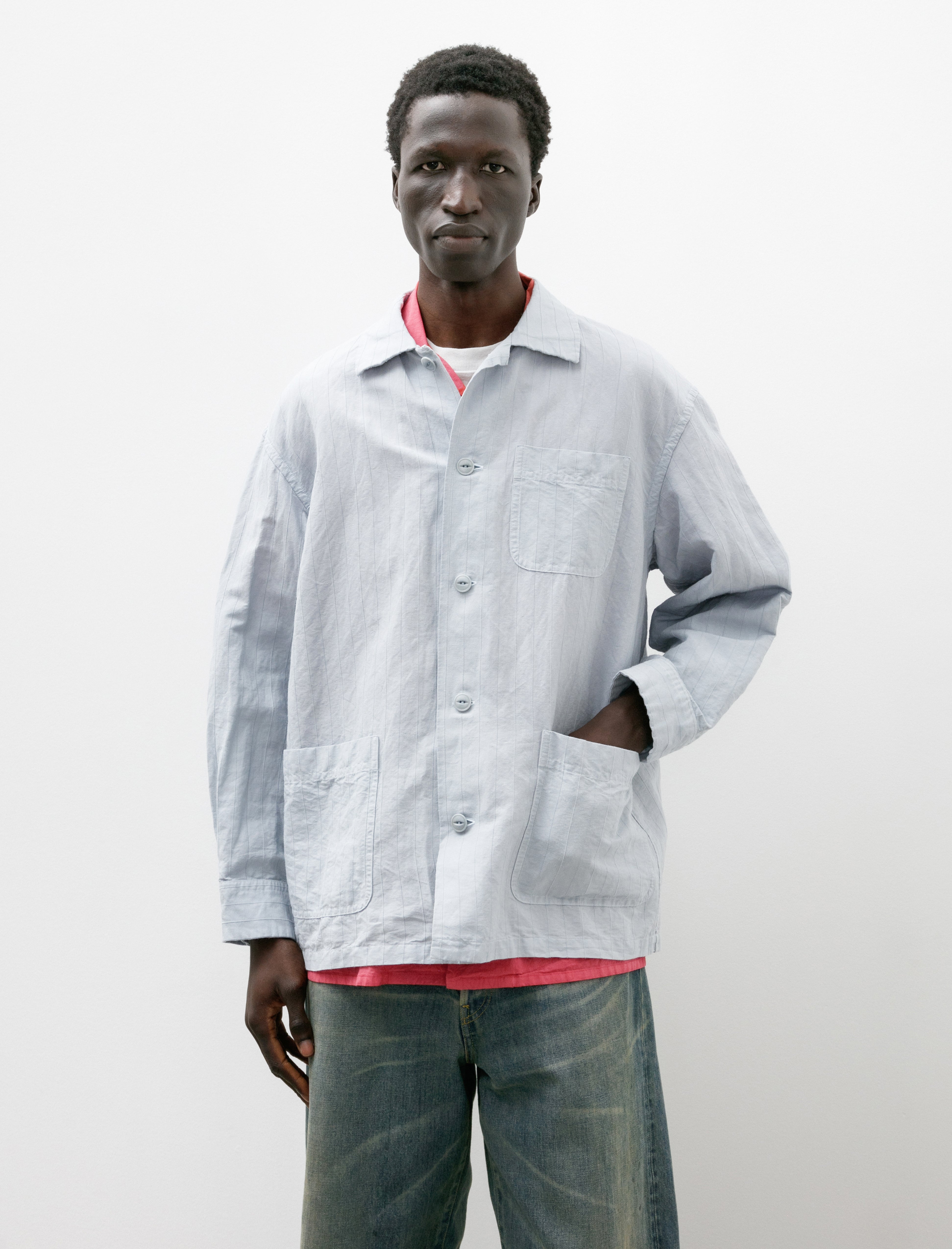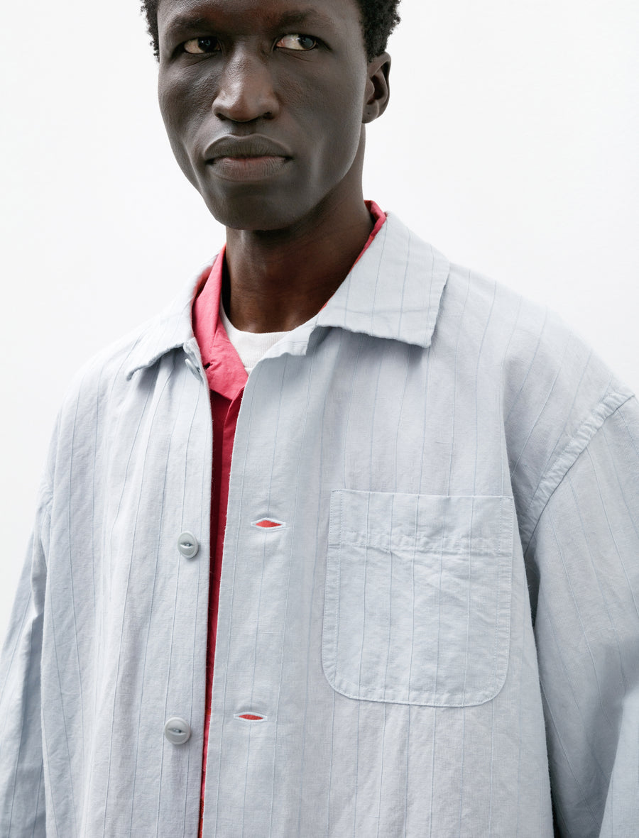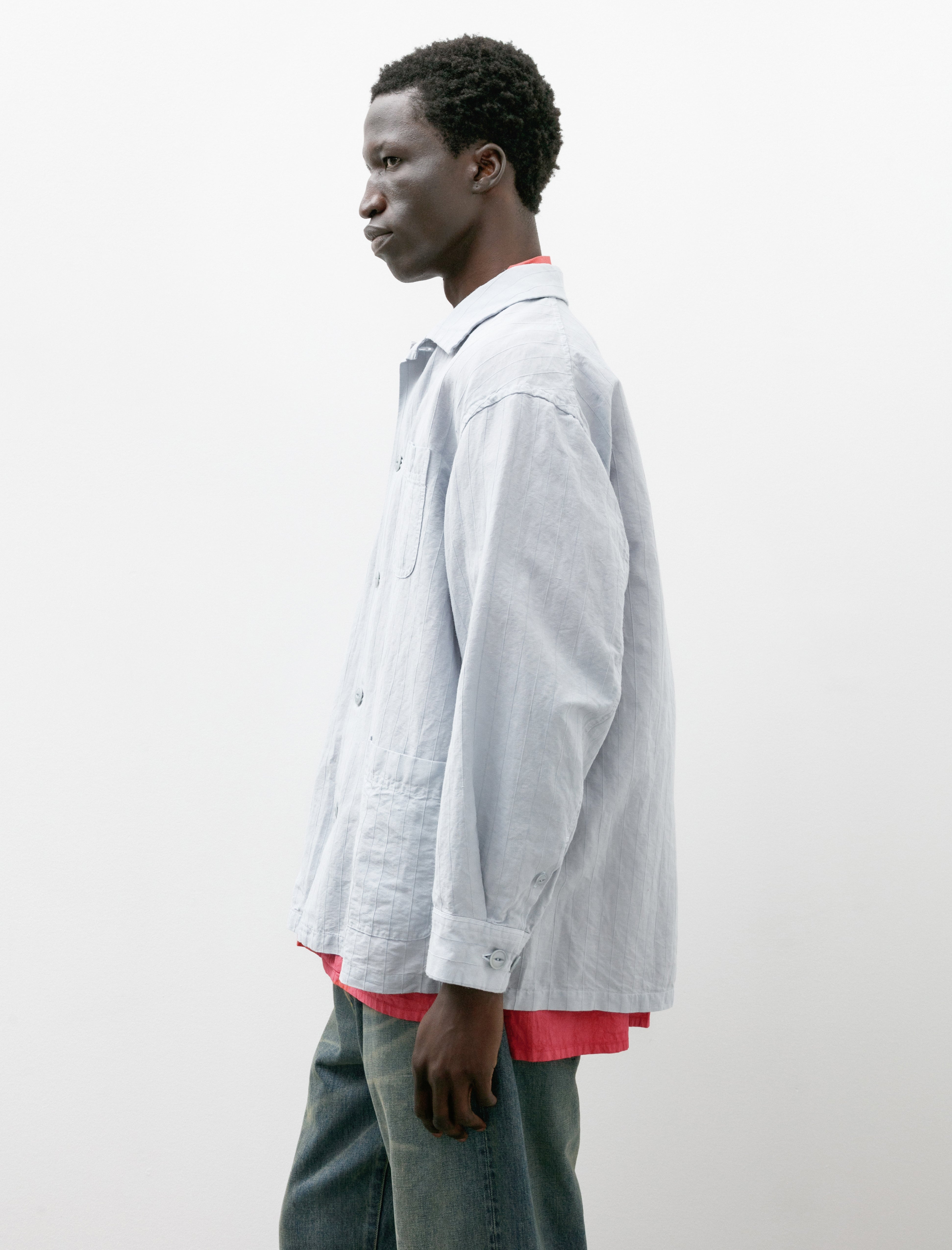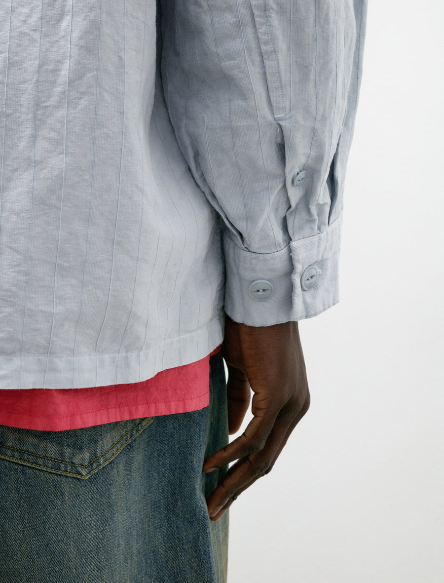 A lightly oversized, loose fitting button-front over shirt cut from a crisp, wrinkled, lightweight linen/ramie/cotton poplin with a textured stripe in a soft sky blue. Features a classic collar, a left breast pocket, patch pockets at the waist, and a flat hem. Easy proportions combine with bouncy crispness of the cloth to produce a generous silhouette with subtle bagginess that is complemented by the gentle forward tilt of two-piece sleeves. Constructed using fine, single needle, flat felled seams throughout for a long lasting finish that leaves a tidy elegant interior.