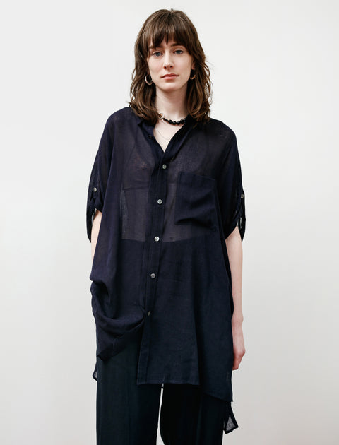 A relaxed fitting sleeveless shirt cut from lightweight semi-opaque cotton gauze. Featuring a cocoon like shape through the body, single patch pocket and a reinforced button down face detailed with an unfinished edge. Perfect for layering.