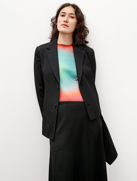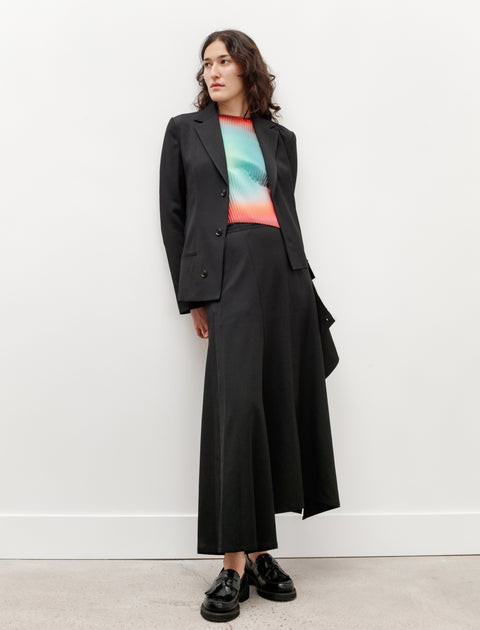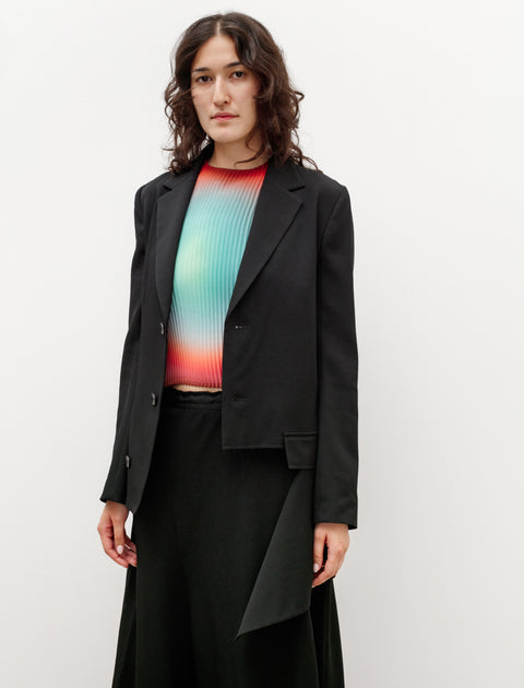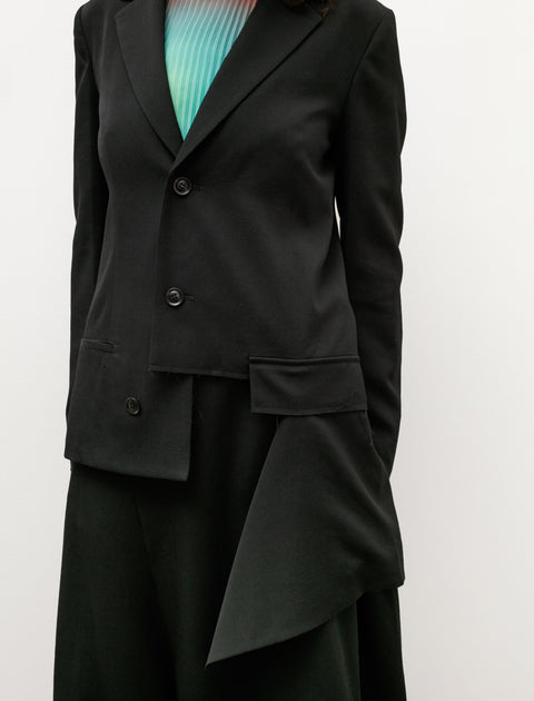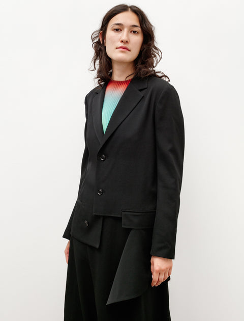 This mid-weight blazer from Y’s features a distinguishing asymmetrical hem. When done all the way up, a large square of fabric extends the placket, adding playful peculiarity to this garment.
