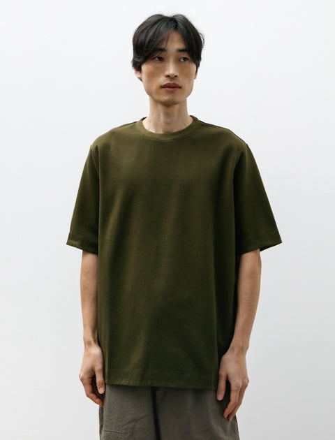 A generous, relaxed fitting t-shirt cut from a dense cotton pique jersey in a faded deep olive. Extended narrow sleeves lend a sleek, elegant look that balances the roomy body to create a controlled silhouette imbued with a sense of sophisticated ease. Completed with a ribbed neckline and straight-stitched single needle hemming at the sleeves and body.