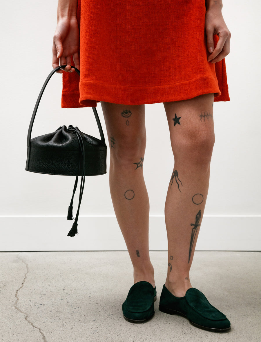 Taking inspiration from vintage bags used to store men's detachable collars, this darling leather bag is the perfect cherry on top of any outfit. Made of a subtly grained leather from Italy, it is soft yet durable. It has a leather loop handle with a tassel drawstring opening that gives it a unique appearance. Complete with a sturdy circular base, it is the perfect size for on-the-go.