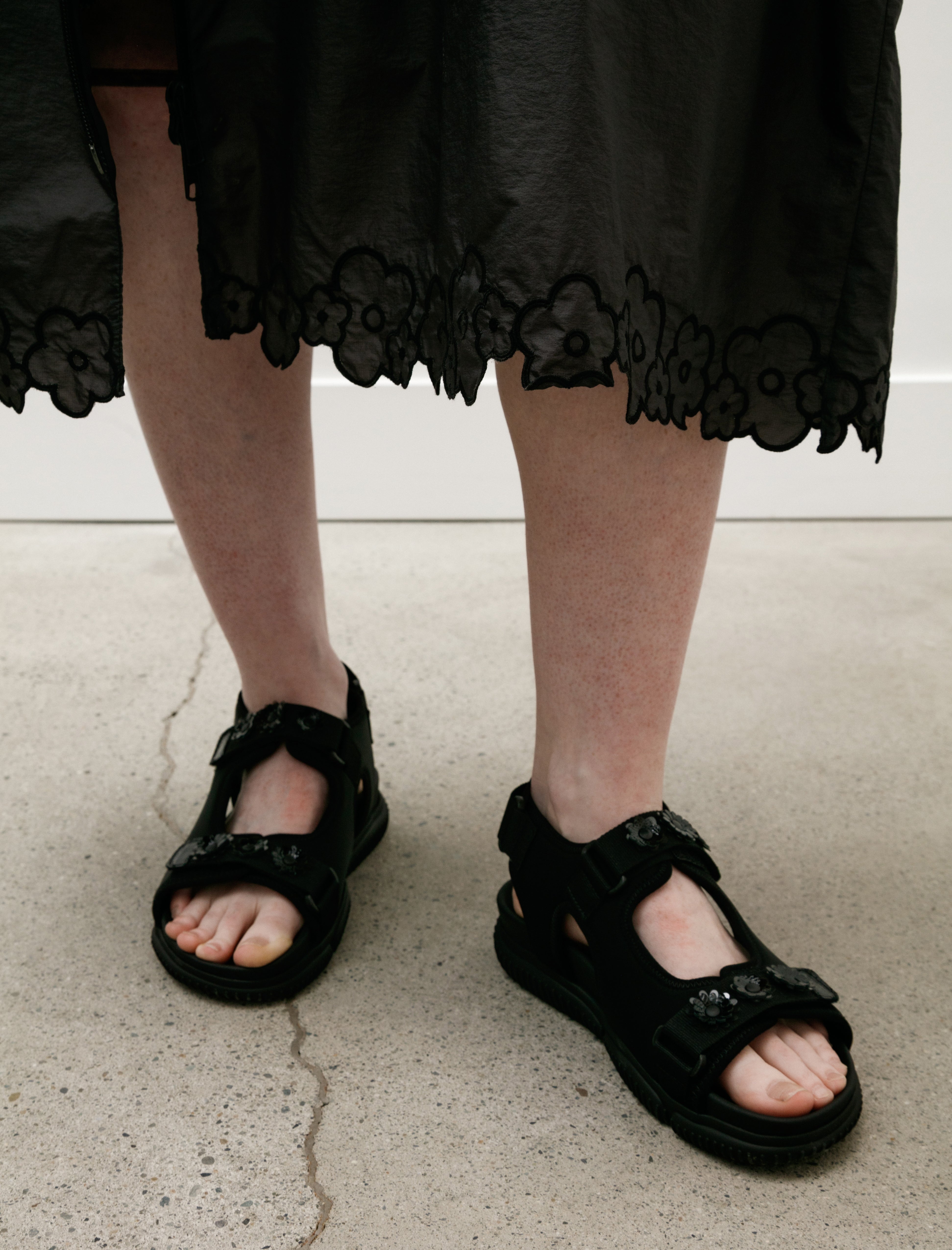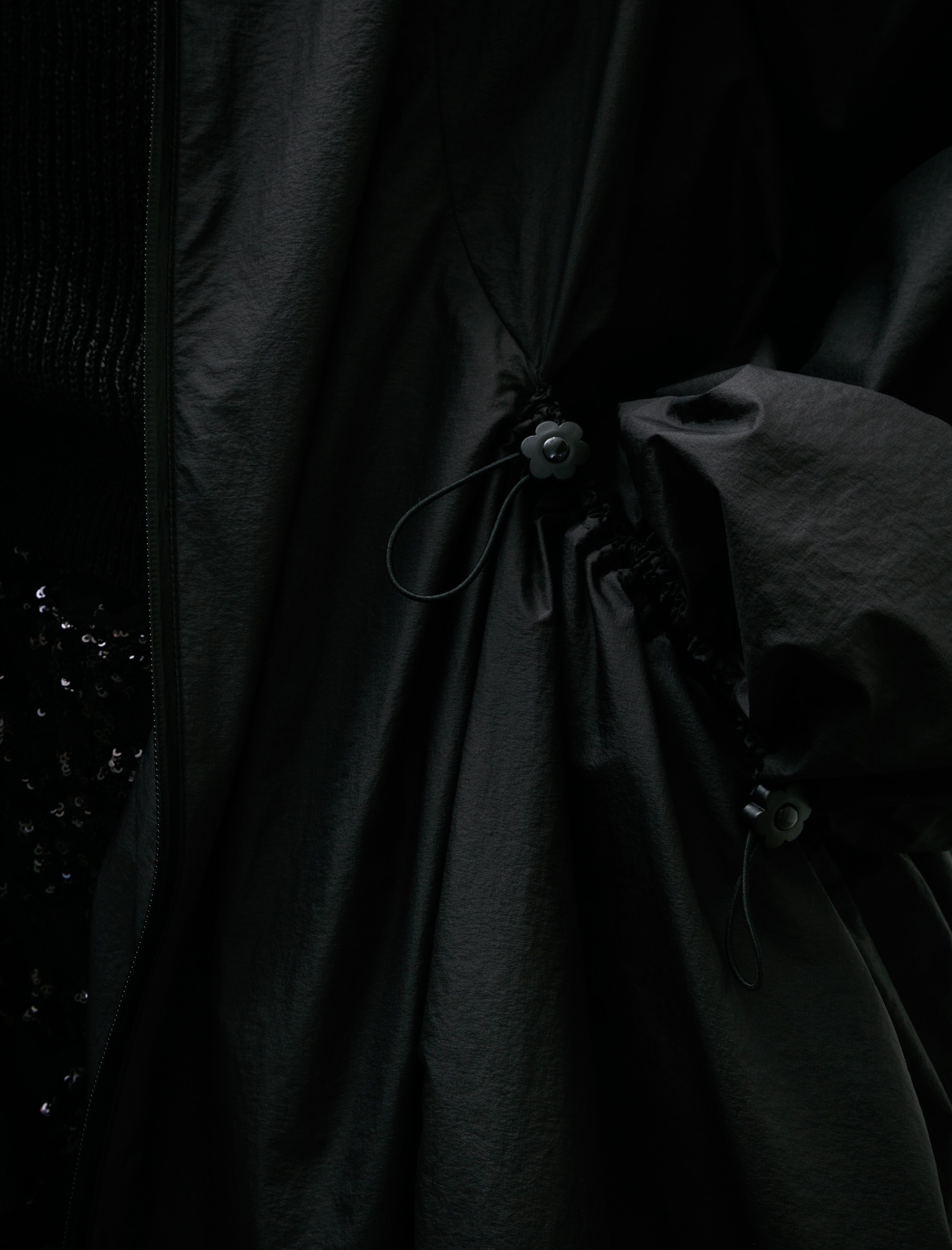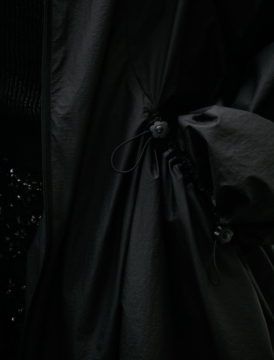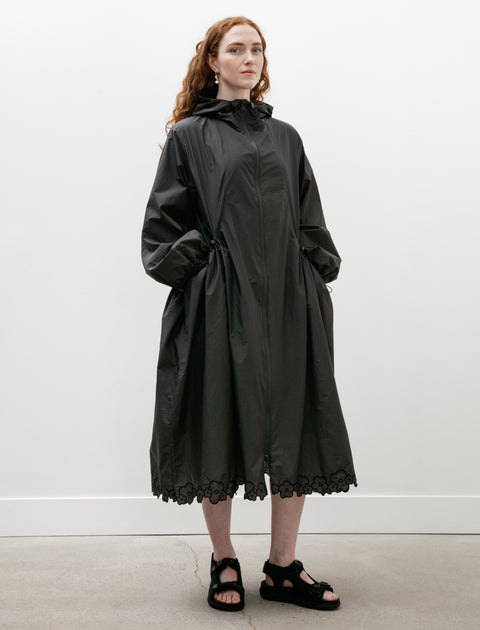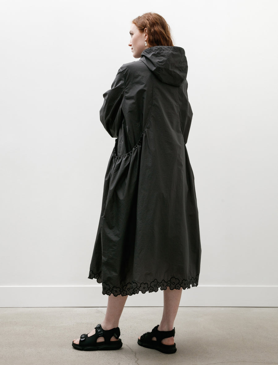 Bringing some playful charm to classic outerwear, this coat is the perfect lightweight layer for warmer weather. Made from an airy technical fabric, it has a long, oversized silhouette that perfectly blends utility with elegance. The adjustable hood and high neckline offer protection from the elements, while delicate details like floral-shaped drawcord pullers, gathered pockets, voluminous sleeves, and a scalloped hem with embroidered florals provide a romantic edge. Proving that functionality doesn’t have to be boring, this coat is sure to be a new staple.