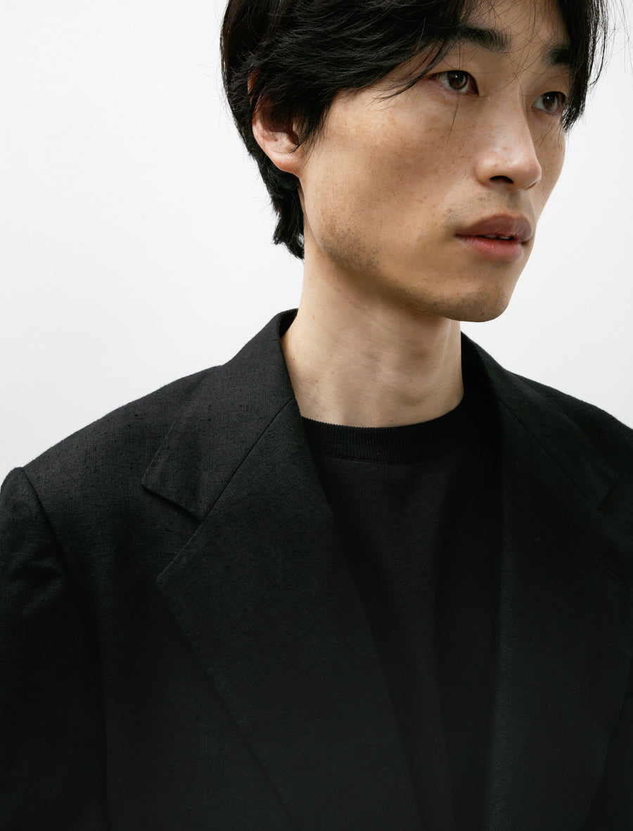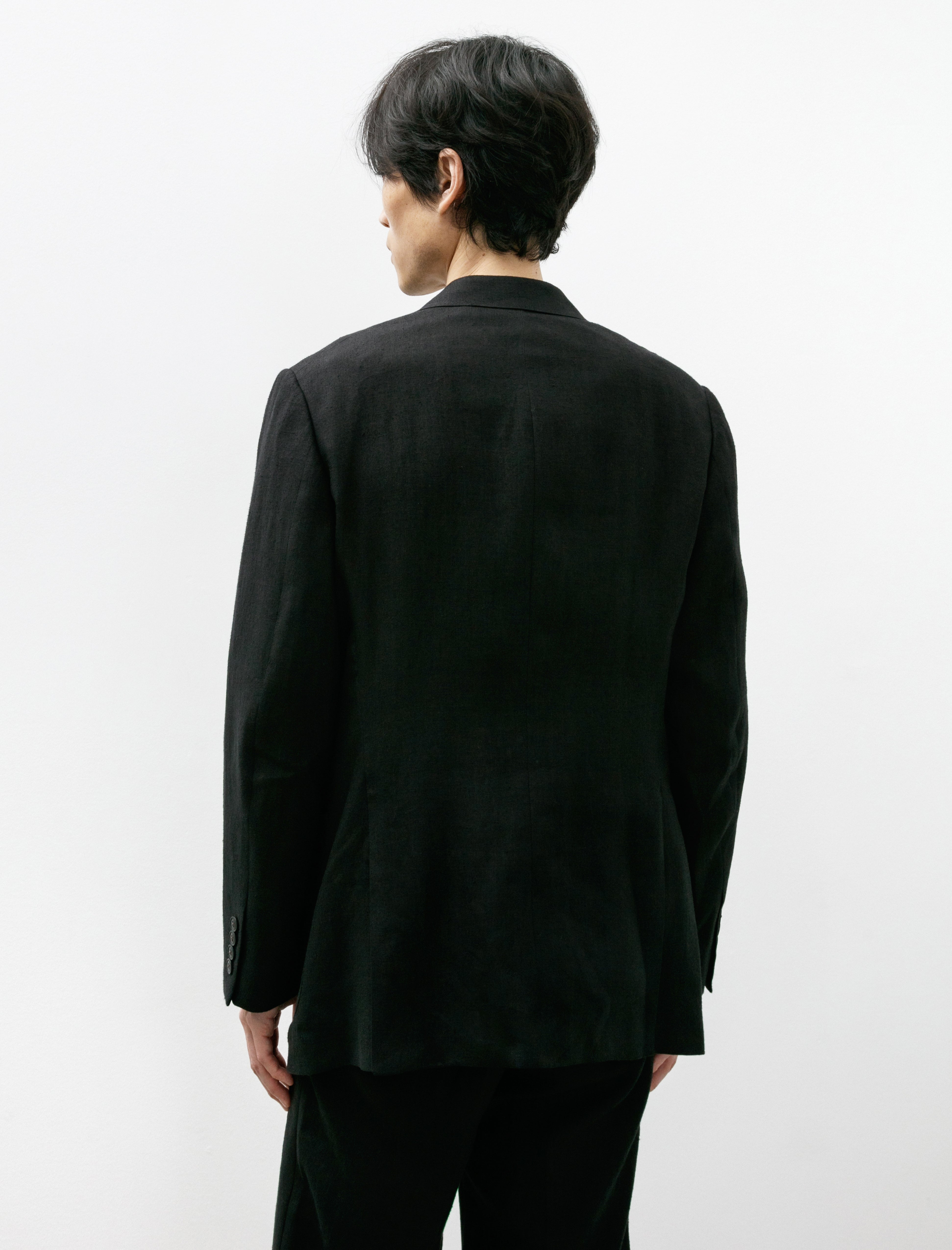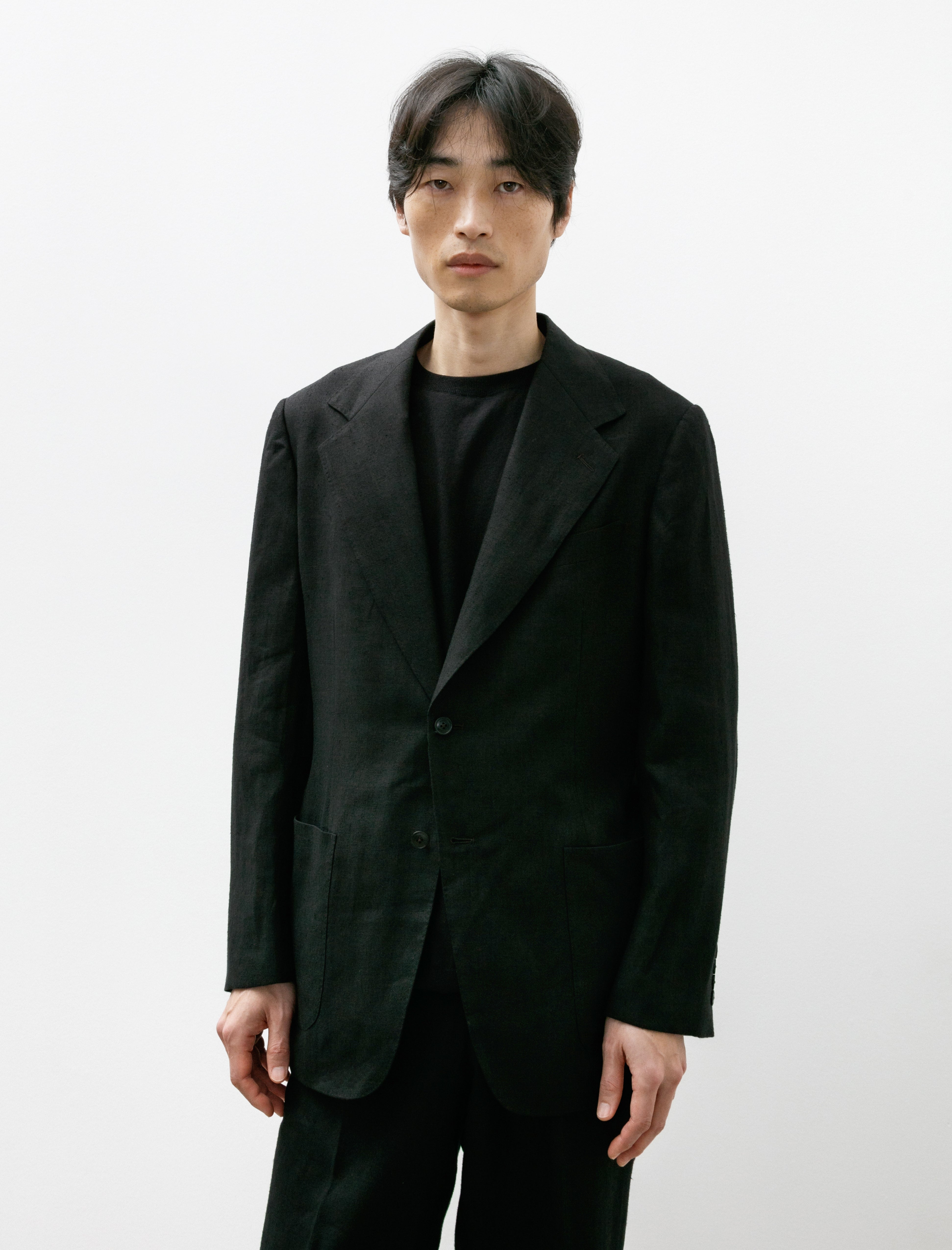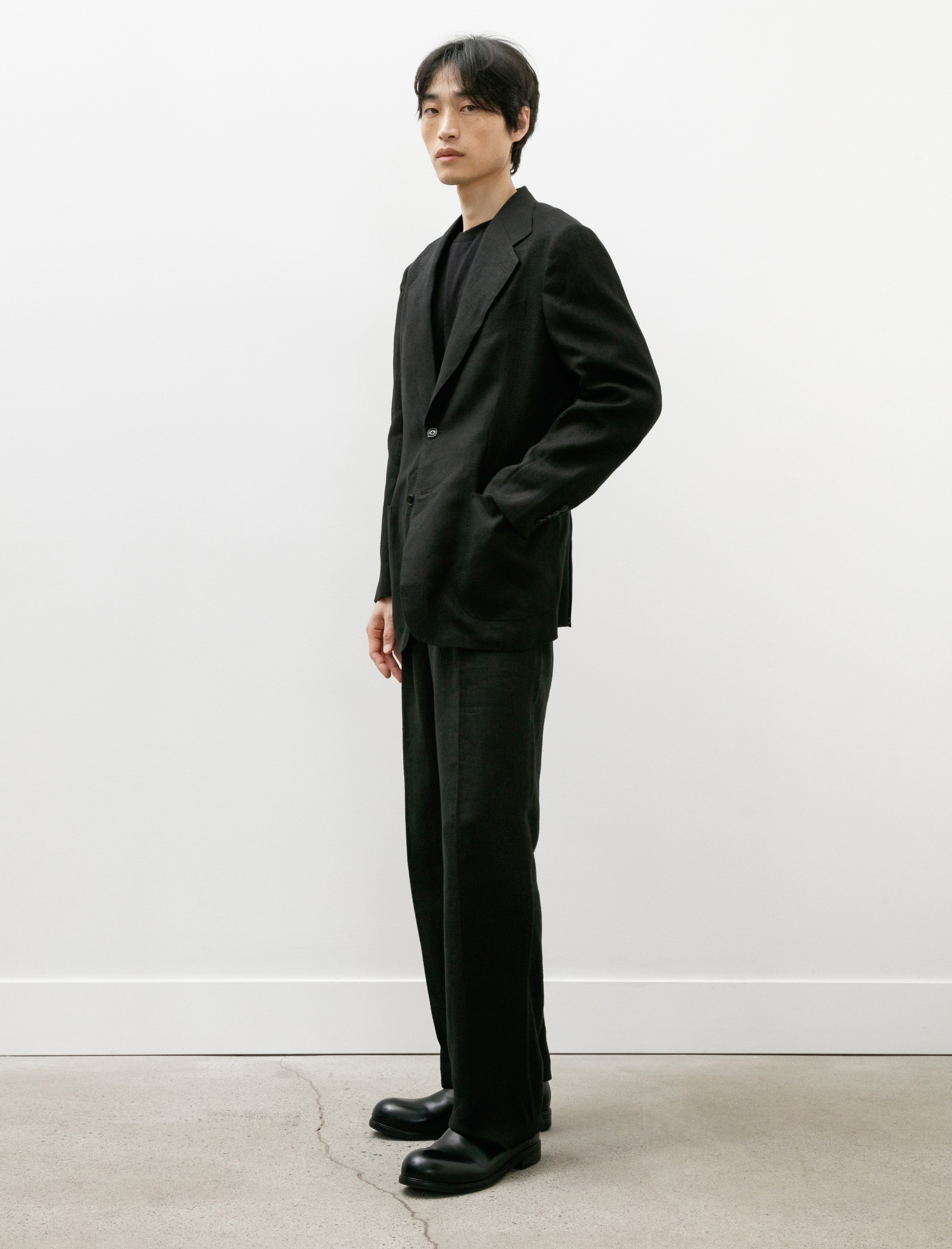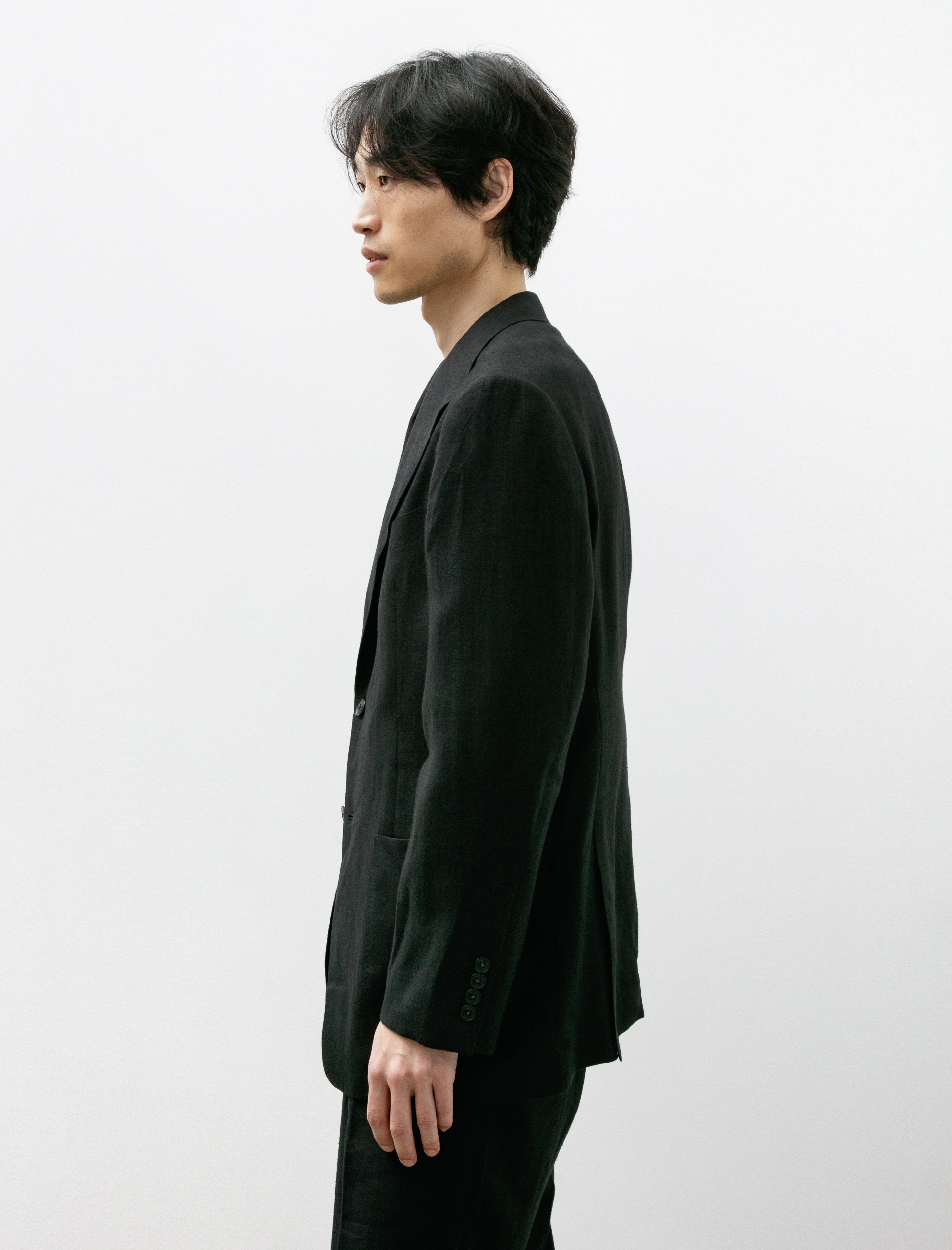 A tailored two-piece suit cut from a super fine, plain woven, summer-weight hemp suiting cloth in black with a light slub at the surface.