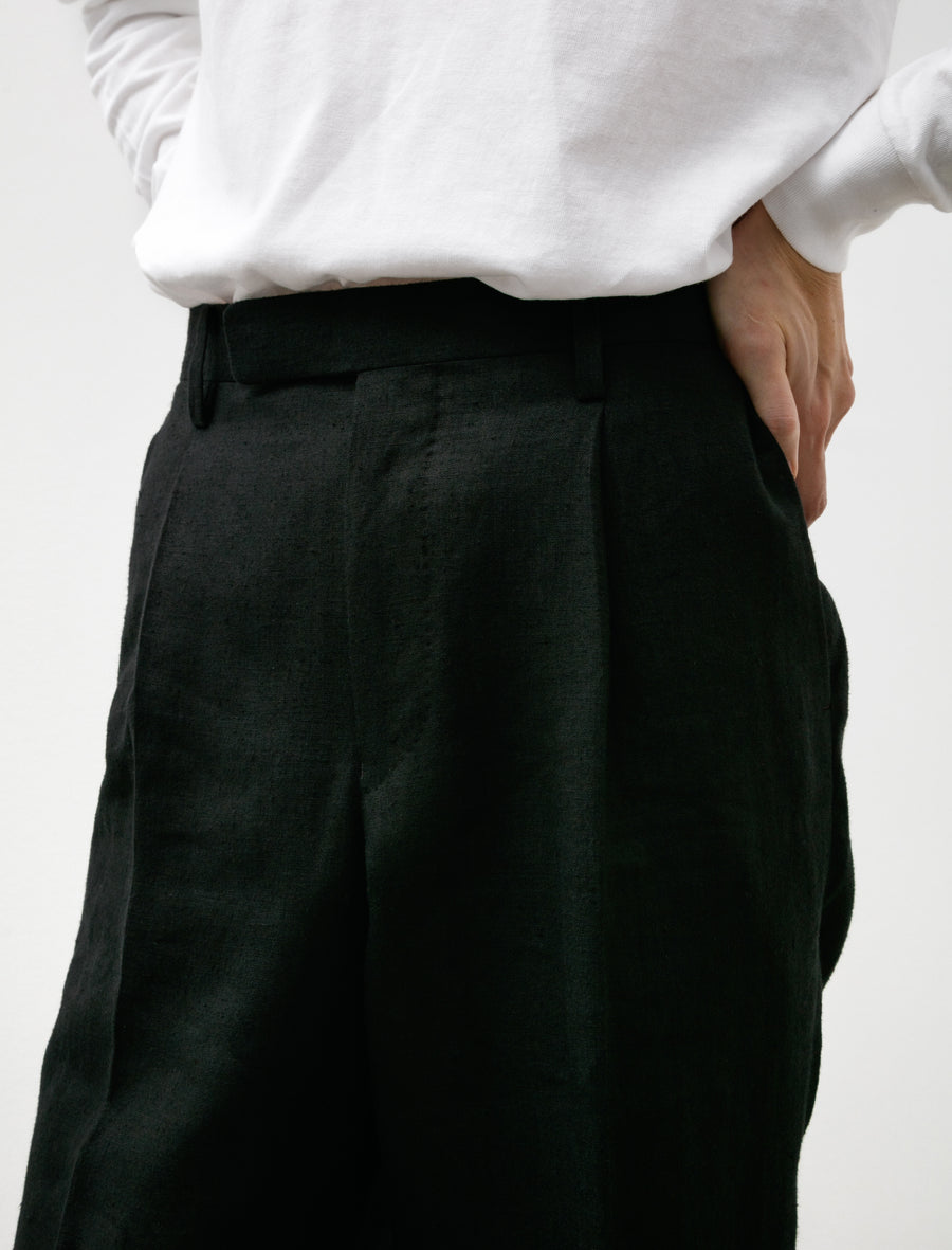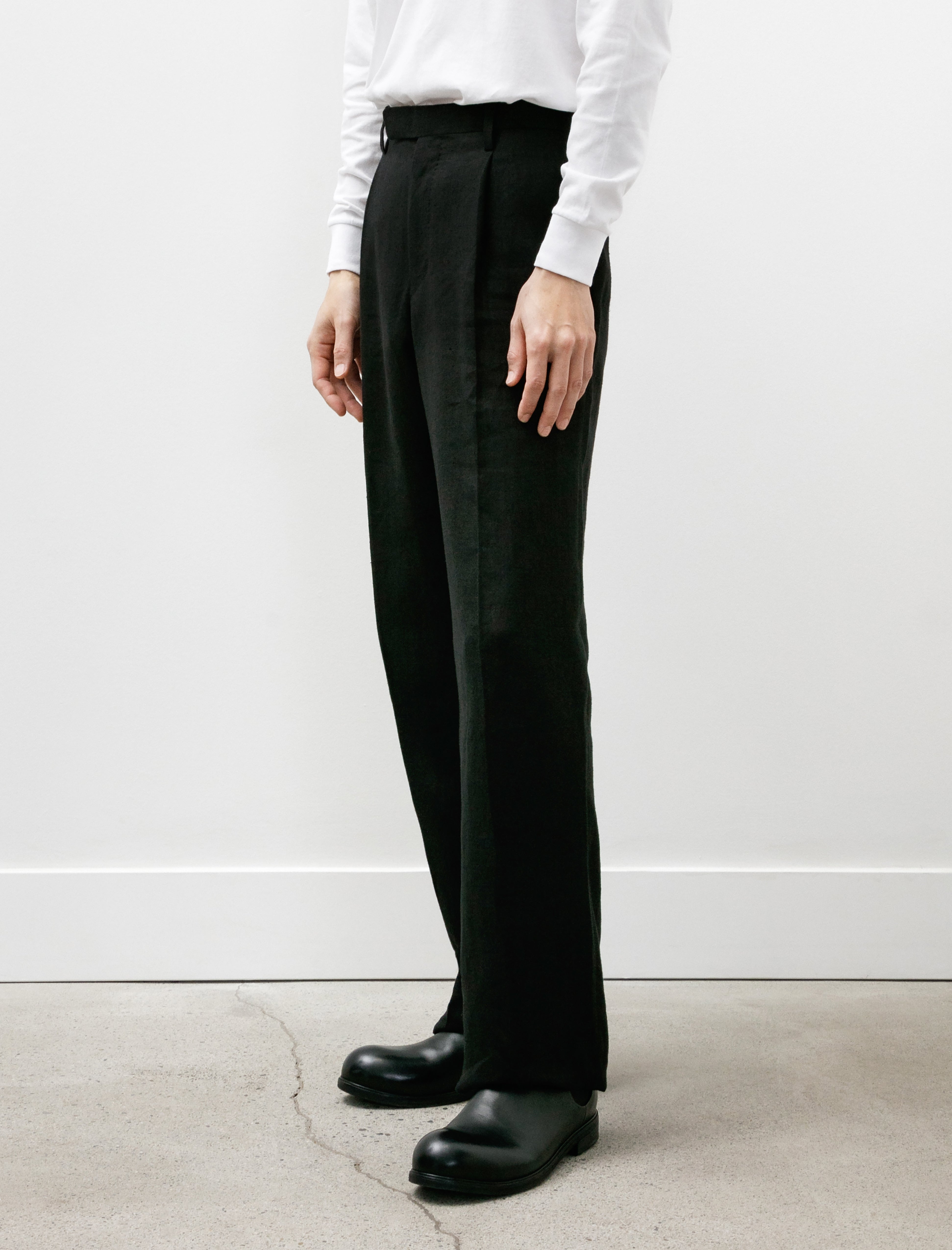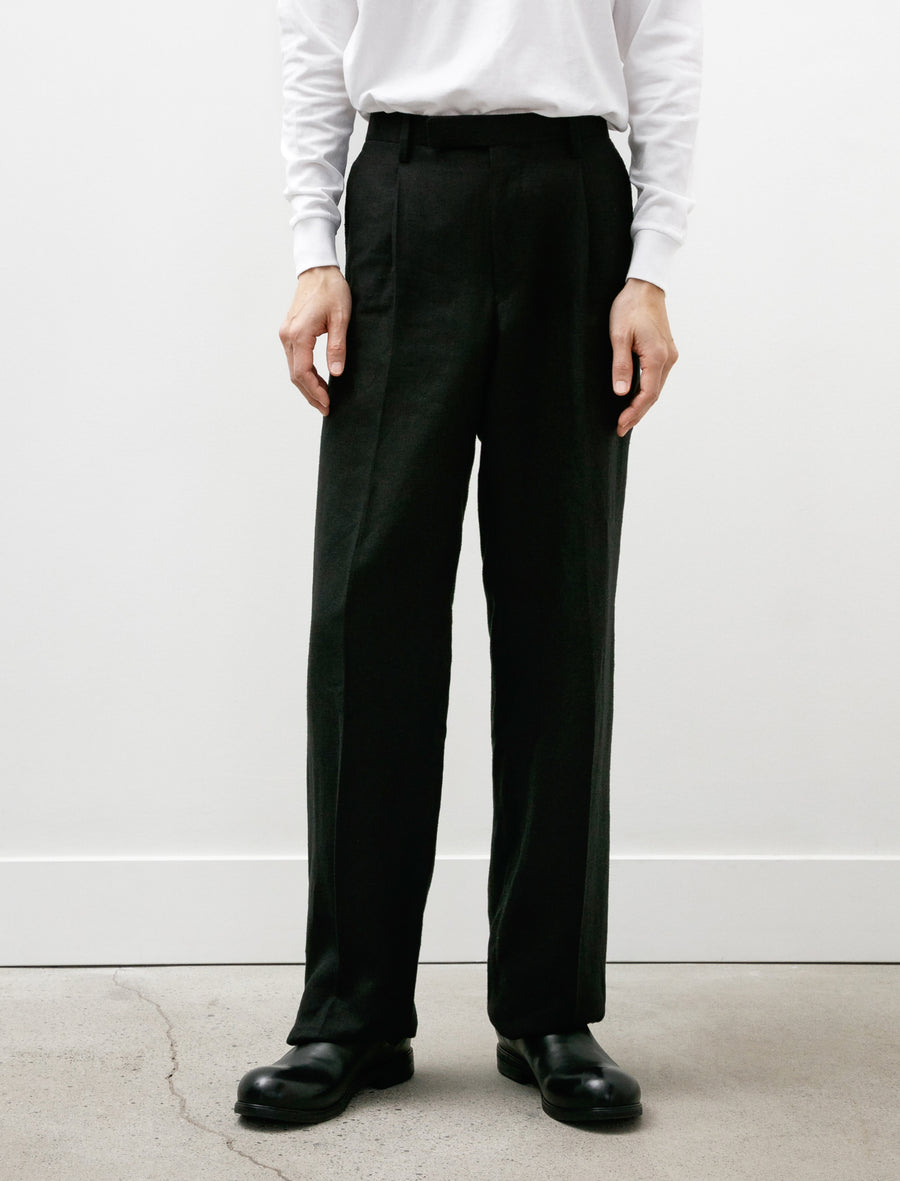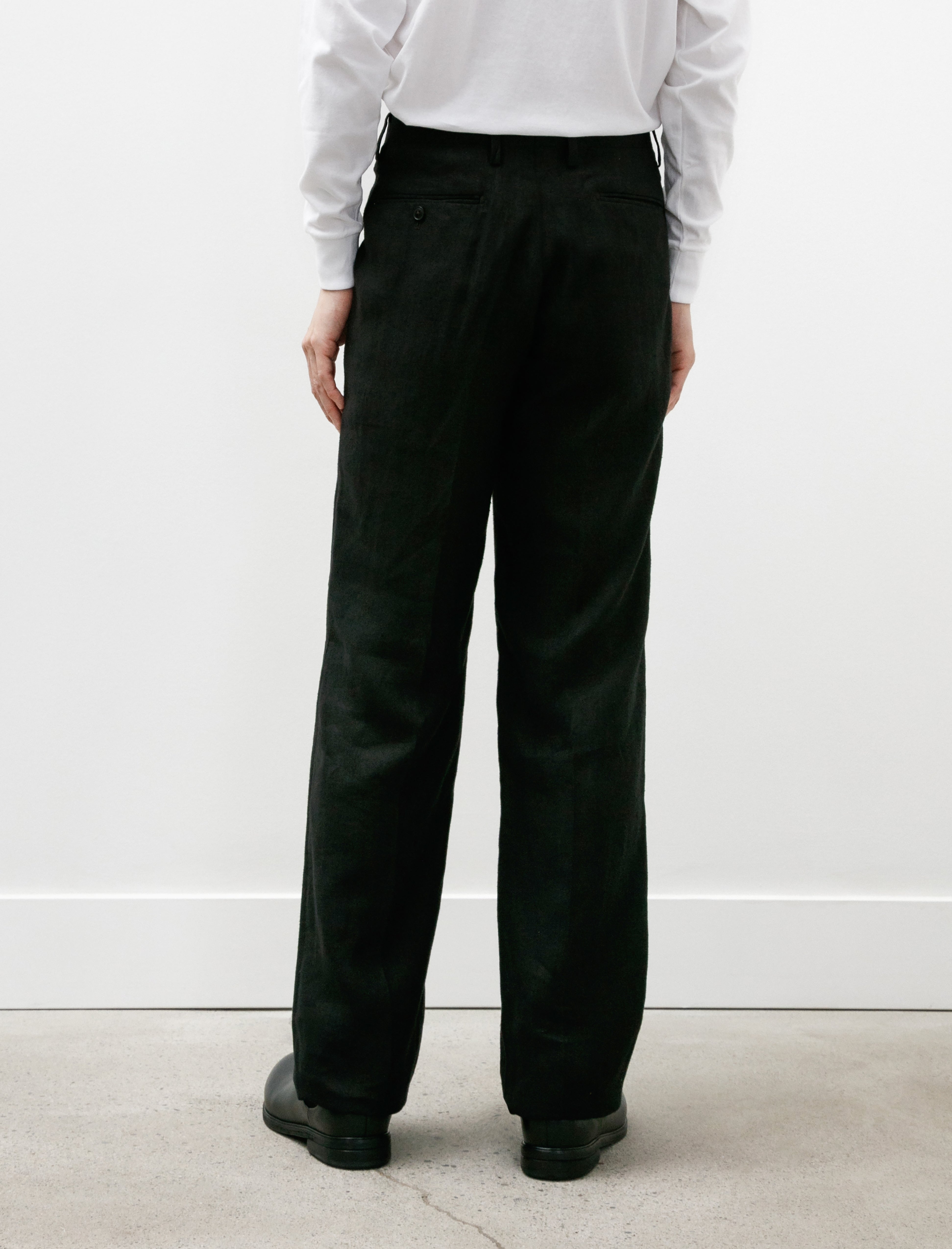 Trousers feature a three-point closure, a zip fly, half inch pleats at the waist, front slash pockets, and rear welt pockets. Considered ease through the leg offers a lightly relaxed silhouette to showcase the light drape of the hemp while maintaining formal lines throughout. Completed with a partial lining to the knee at the front for improved comfort and unfinished hems to be hemmed to the desired length. Additional ease through the back rise can be let out up to two inches for added volume.
