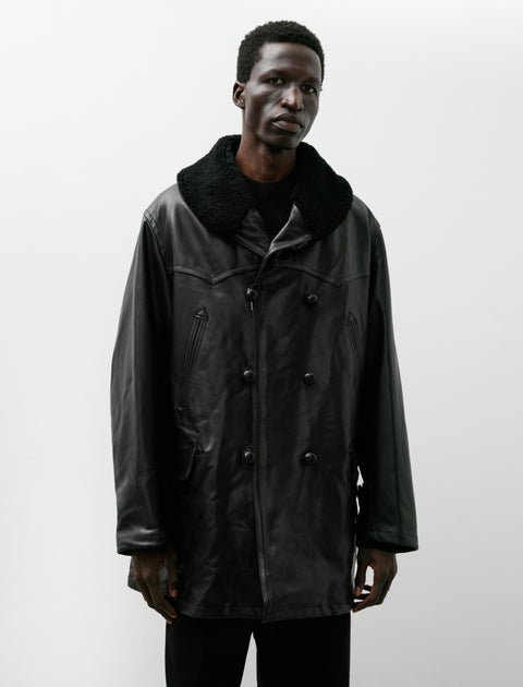 An oversized, Mackinaw style coat cut from a supple, yet sturdy, fine grained lamb leather with a pleasing heft in black. Features a generous shearling lined shawl collar, a narrow double-breasted closure, hand warmer pockets, flap-closure patch pockets at the waist, and button-fastening tabbed cuff cinches. Utilitarian detailing with western-style yokes at the front and back offer a subtle contrast against the elegant surface of the leather, paying homage to the military reference material with a more sophisticated touch. Constructed with a full lining for a long lasting, fully encased finish; knotted leather buttons with reinforcement backings at the closure, Corozo buttons at the cuff.
