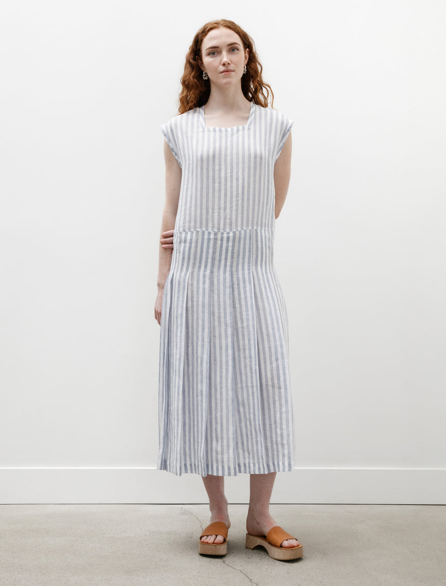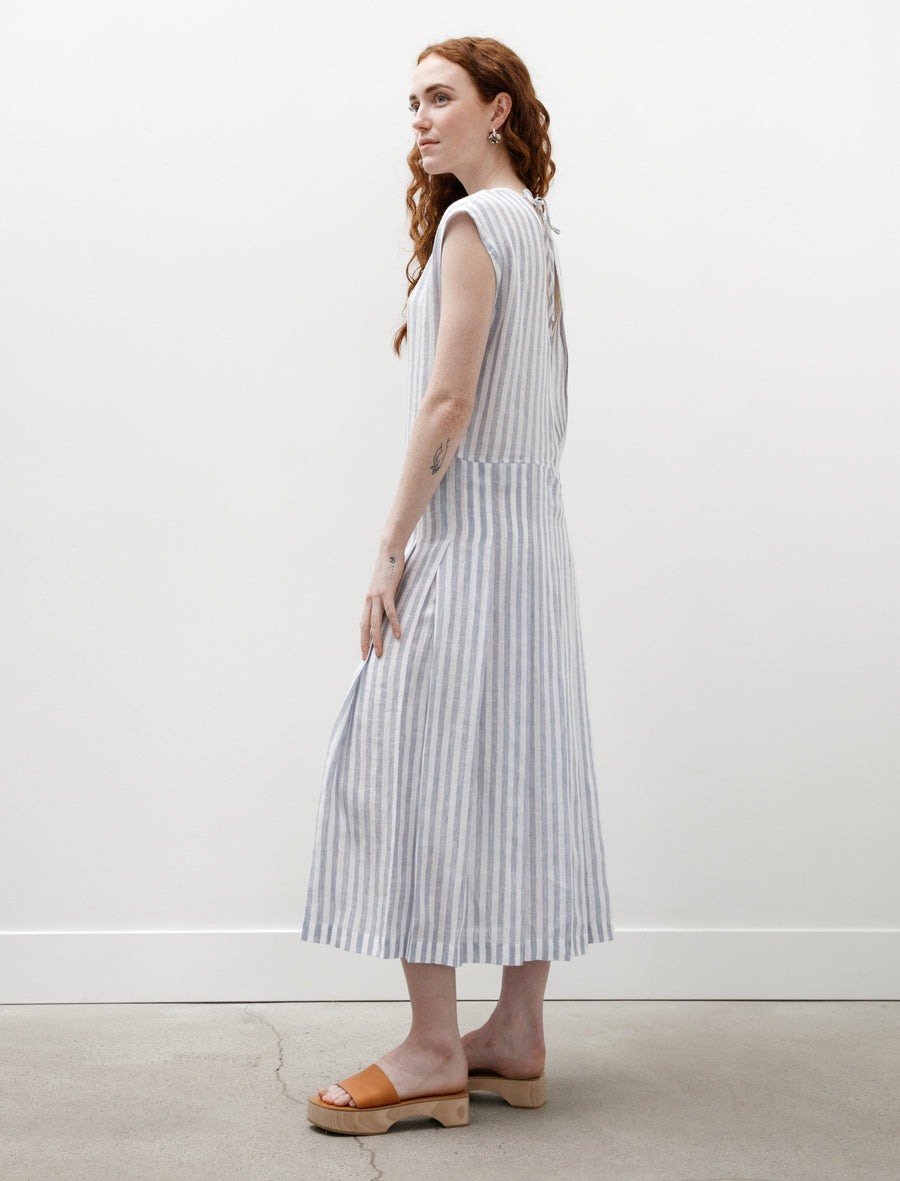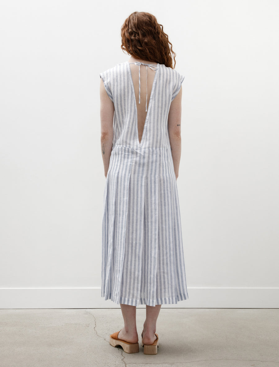 Sophisticated with a touch of sporty charm, this darling dress is a refined take on a classic tennis dress. Made entirely of lightweight Belgian linen, its airy feel is perfect for warm temperatures. The silhouette is straight and roomy with cap sleeves for a breezy fit. An adorable pattern of vertical light blue and white stripes paired with the square neckline and crisp pleats at the skirt gives this dress a touch of vintage charm. Complete with a plunging v-back with a tie closure, this versatile dress embodies timeless elegance.