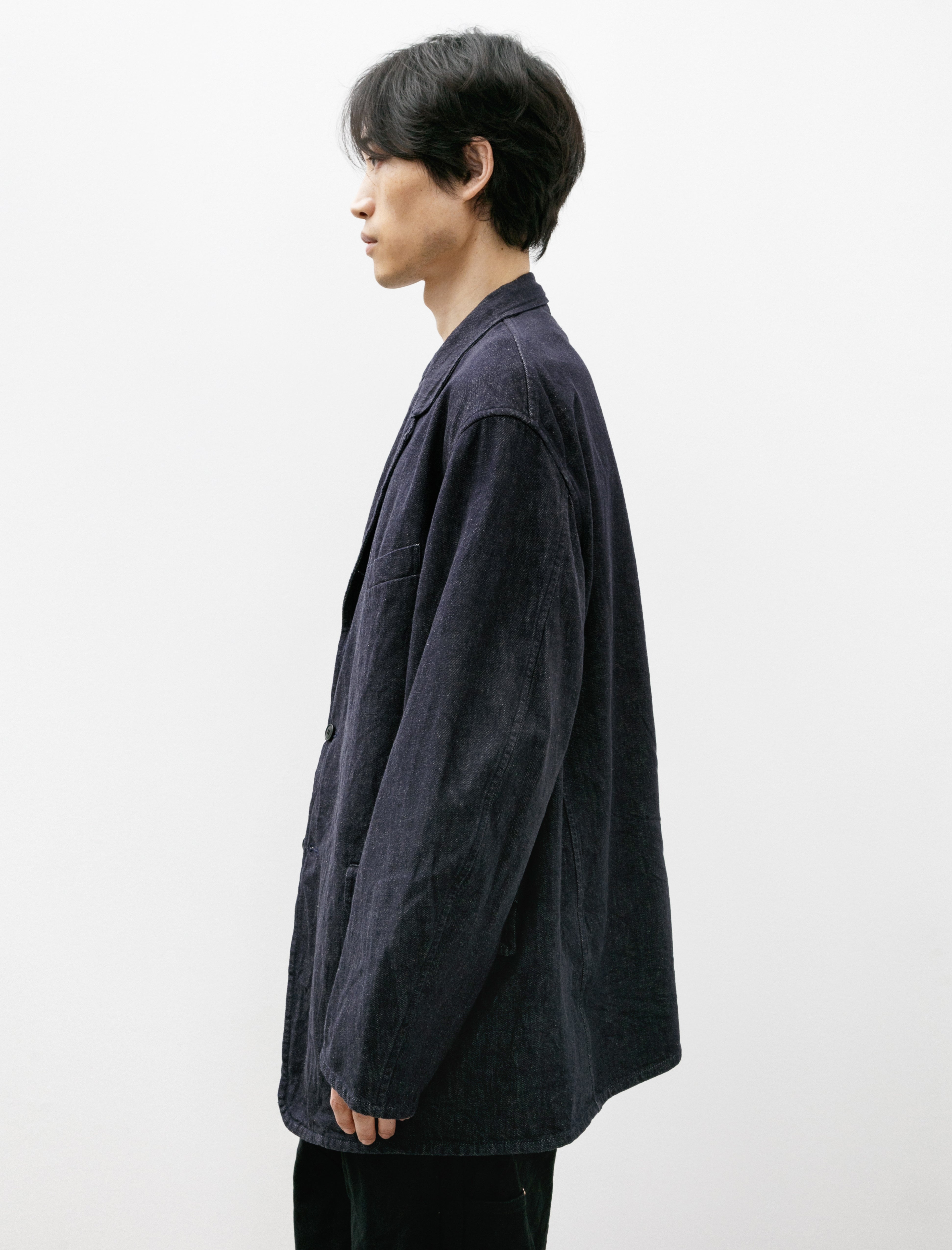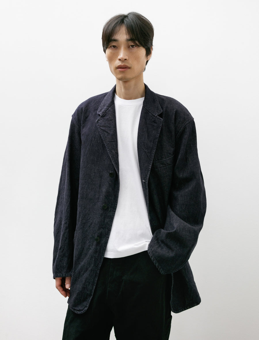A lightly oversized, unstructured, three-button blazer cut from a lightweight, high density, rinsed cotton denim in deep navy. Features a wide notch lapel that is accented with a narrow collar, a left breast pocket, and flap closure welt pockets at the waist. Easy proportions throughout are carefully cut to offer subtle contouring of the body, while maintaining soft draped lines the shoulders and back. Constructed using fine single needle flat felled seams throughout for a long lasting finish that leaves a clean interior; Corozo buttons, two inner patch pockets.