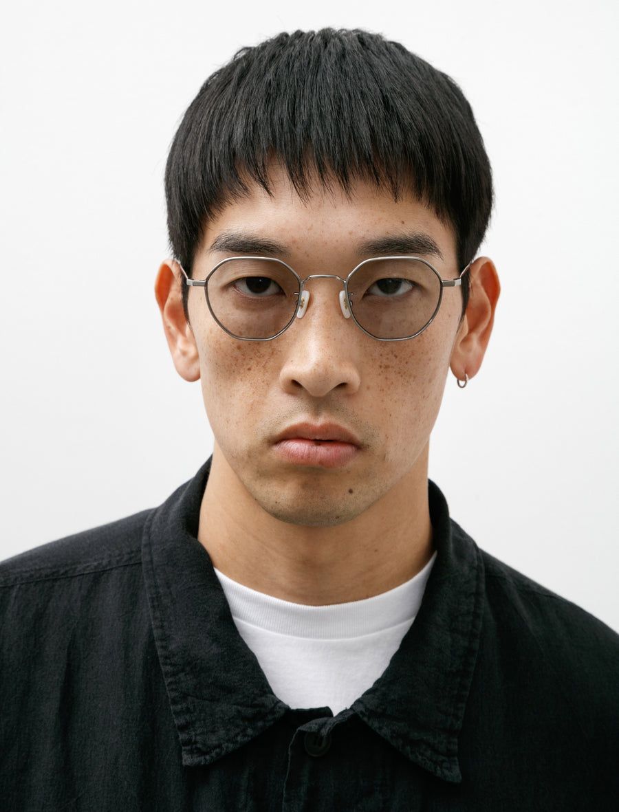A minimal, lightweight wire frame built from a smokey, dark titanium alloy. Mitred edges with soft curves at the lenses combine with faux Mother-of-Pearl nose pads for a sense of timeless subtle elegance. Completed with a three-bar hinge and light grey polarized lenses.