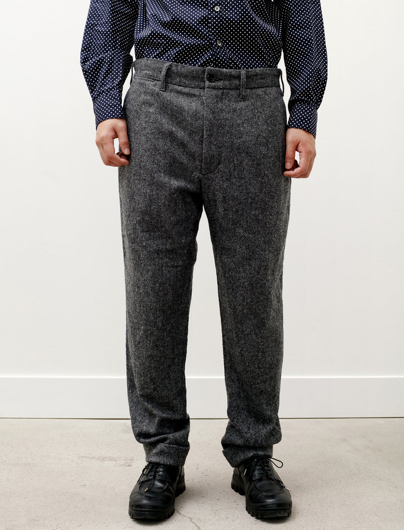 A relaxed fitting long sleeve button shirt in a white on navy polka dot printed cotton sateen. Patch pocket at left breast. Features a button-down collar with pointed collar tips, back yoke with central box, pleat micro pleating detail at button cuff. Curved hem with dropped back hem and gusset reinforcement at side seams. Fully felled seam finishing with clean finished, two-piece yoke.