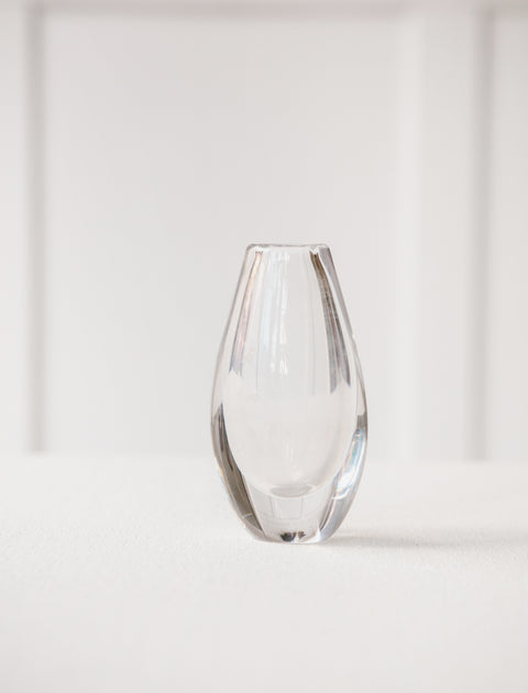 Satisfyingly thick and heavy, this small bud vase has a simple floral etching on one side.