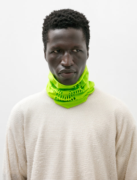A single-piece, tubular neck gaiter knit from a recycled stretch Econyl® nylon in lime green. Engineered perforations at the face create an abstract graphic evocative of a butterfly among other things and allow the gaiter to alternatively serve as a mask. Warp knitting technique creates a highly stable shape with strong recovery when stretched. The tube can additionally be styled either as a skirt or a tube top.