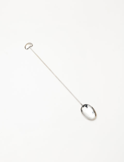 A long spoon made of copper and plated in sterling silver with a delicate hammering on the head and a small bean on the end.