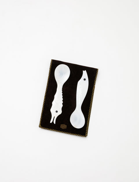 A set of two hand carved spoons in a sea creature motif. Designed to be both functional and whimsical, these make an excellent addition to any dining table.