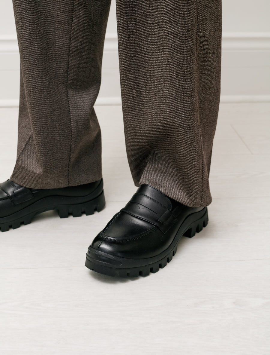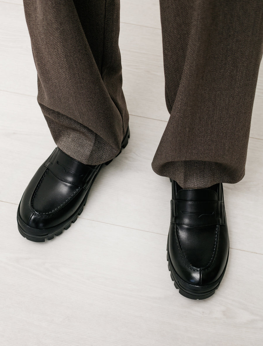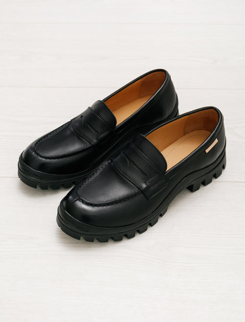 A hardwearing hybrid take on a classic penny loafer cut from a smooth-surfaced cow leather in black. Low-profile moc-toe construction combines with the classic apron detailing for a sense of timeless elegance while the heavy Vibram lug sole offers a utilitarian edge. Completed with a full lining in natural veg-tan leather.