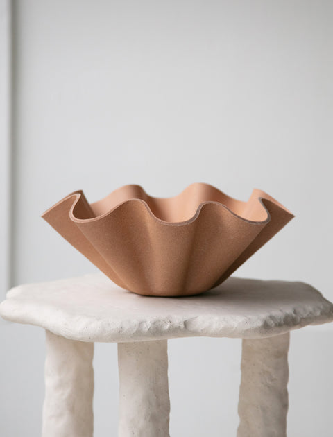 The perfect home for fruit, trinkets or simply displayed on a shelf, this leather bowl has a wavy shape that is reminiscent of a seashell. The base mold is created using a 3D printer which is then used to shape the bowl using a traditional leather manufacturing technique called wet forming. The vegetable-tanned leather will gradually change over time, completing the design process.