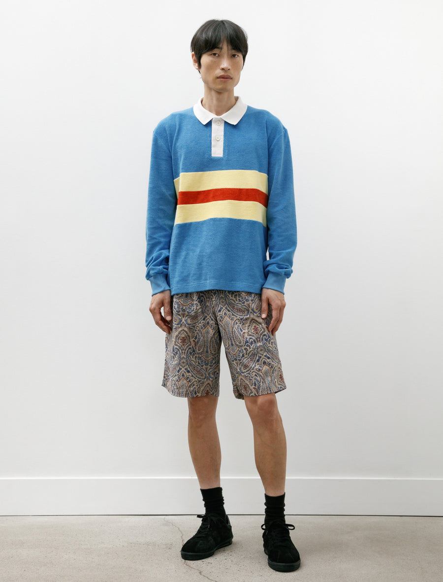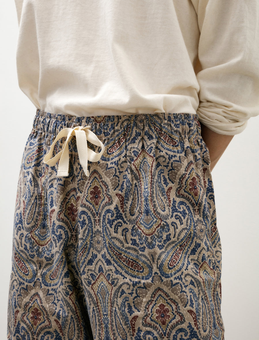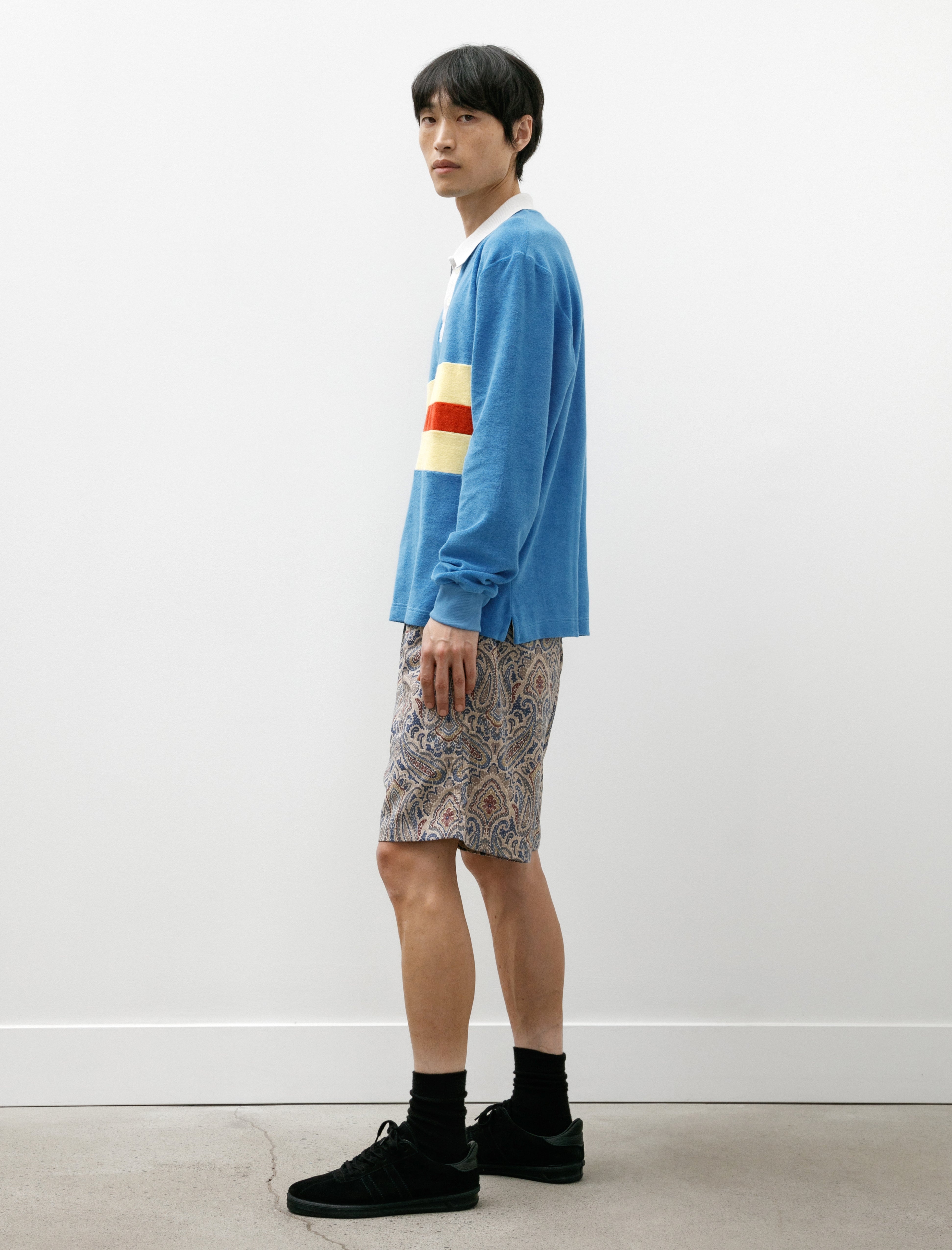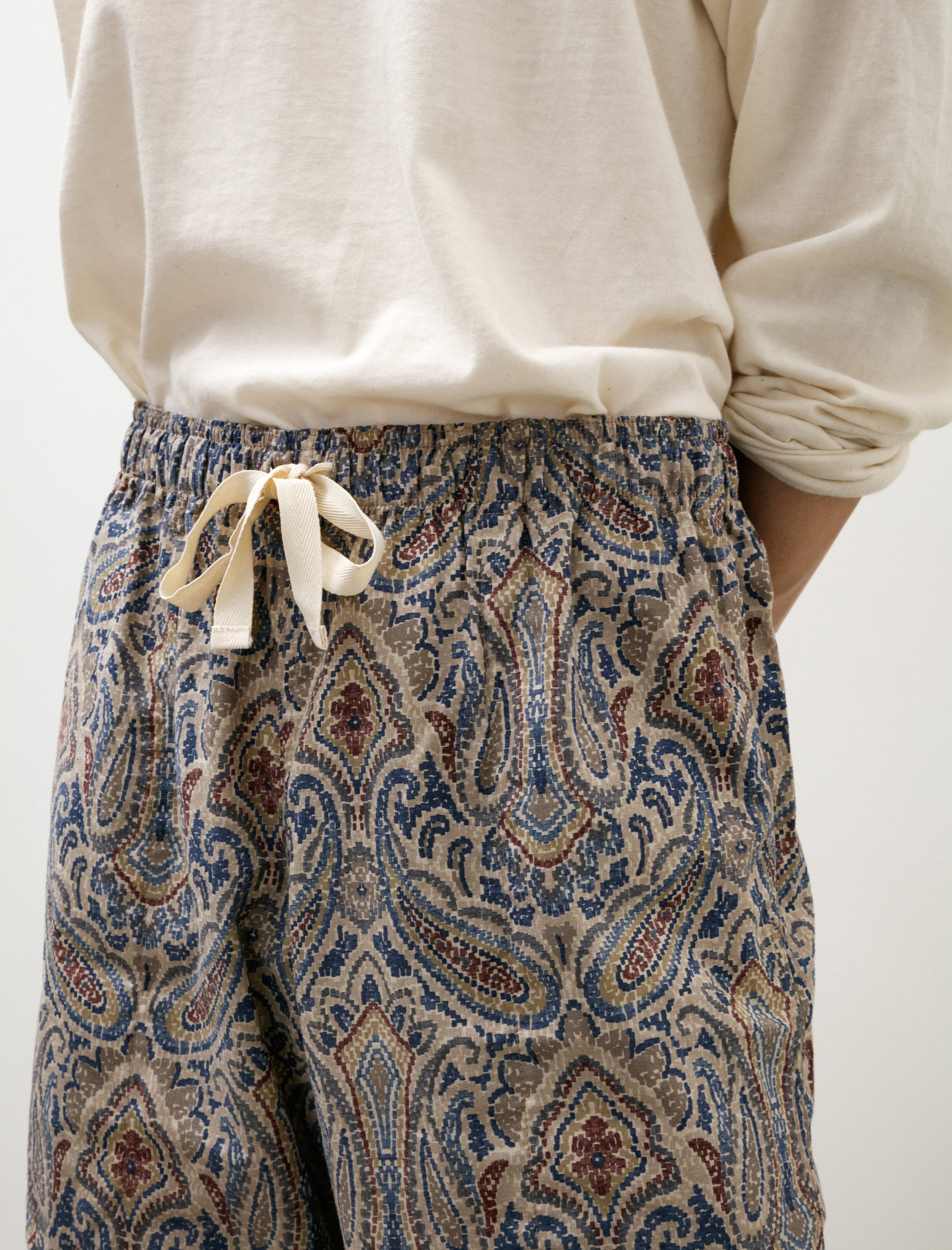 Relaxed fitting, knee-length pull-on shorts cut from a lightweight, paisley printed cotton. Feature an elastic waistline with an external drawstring, front on-seam pockets, and a single rear patch pocket at the right side. The roomy fit offers a sense of balanced ease without appearing excessively large, perfectly suited for summer days in and out of the city. Constructed using flat felled seams through the seat and inseam for improved durability at high stress points.