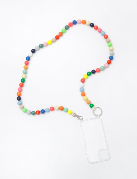 - Wooden beads, cord, vegan and non-toxic varnish, metal hardware and a plastic phone case