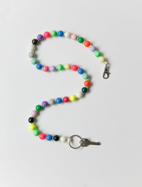 Handmade in her Berlin studio, Ina Seifart makes a little something beaded for everyone. This longer version of her signature beaded keyholder is great for keeping everything together, and can be self fastened around a bag strap, clipped onto your belt loops or worn around the neck for easy access to your essentials. Featuring an elastic band, metal hardware and vegan, non toxic paint.
