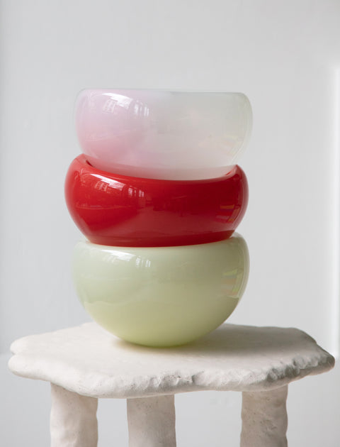 These fun, vibrant bowls are made in Vancouver, mouth blown and formed by artist Jemma van Osch. No two are alike. The perfect catch-all at your bedside for jewellery, or as a treat bowl sweeter than the bonbons it may hold.