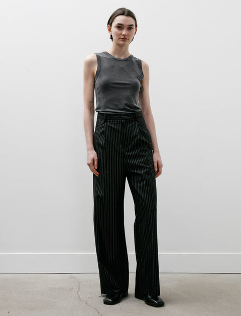 A pair of striped trousers like no other. Made from a lightweight wool blend fabric, a pinstripe pattern of silver glittery thread lays on top of a black backdrop. They have a super high rise that complements a roomy fit through the leg. At the side seams, an extra panel of fabric that trails down the length of the leg curves around the back with a raw edge for an extra touch of something special. An unfinished hem gives these trousers a modern edge that blends seamlessly with timeless elements, allowing you to wear them for a myriad of occasions.