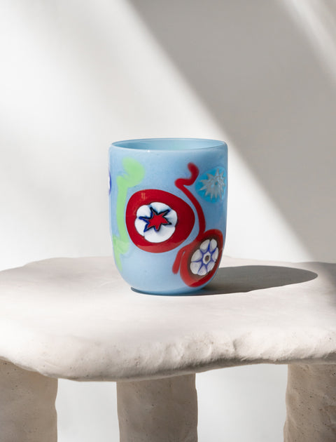 Handmade in Murano by master glassmakers, this drinking glass features abstract murrine details in an array of vibrant colours. Traditional Murano glassware motifs have been reimagined for contemporary table stylings by Laguna B, and are set against a sky blue backdrop to make their ornate colours pop. Due to the handmade elements of each piece, no two glasses are the same.