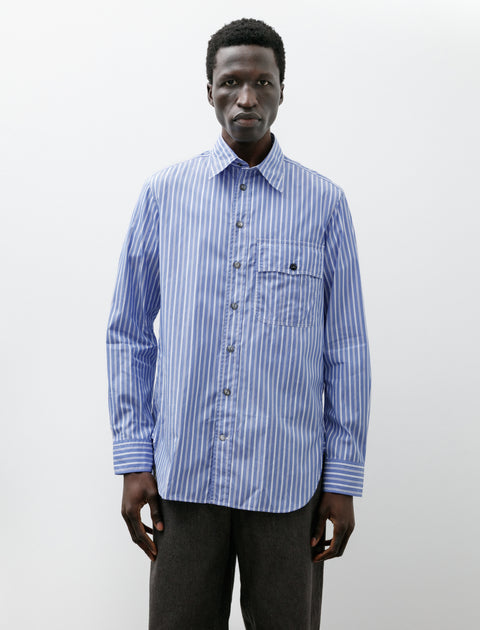 A relaxed fitting, tailored dress shirt cut from a lightweight, Italian cotton poplin in a mixed blue/white stripe. Features a sharply pointed collar with a gentle curve towards the tip, a left breast pocket, a bias cut clean finished two-piece split yoke with a central box pleat, and a curved hem with reinforcement gussets at the side seams. Carefully managed volume and expert tailoring throughout produce an elegant silhouette that is neither excessively large nor fussily restrictive. Constructed using fine, single needle, flat felled seams throughout for a long lasting, encased finish; completed with rounded, logo debossed, dark tone Mother of Pearl buttons.