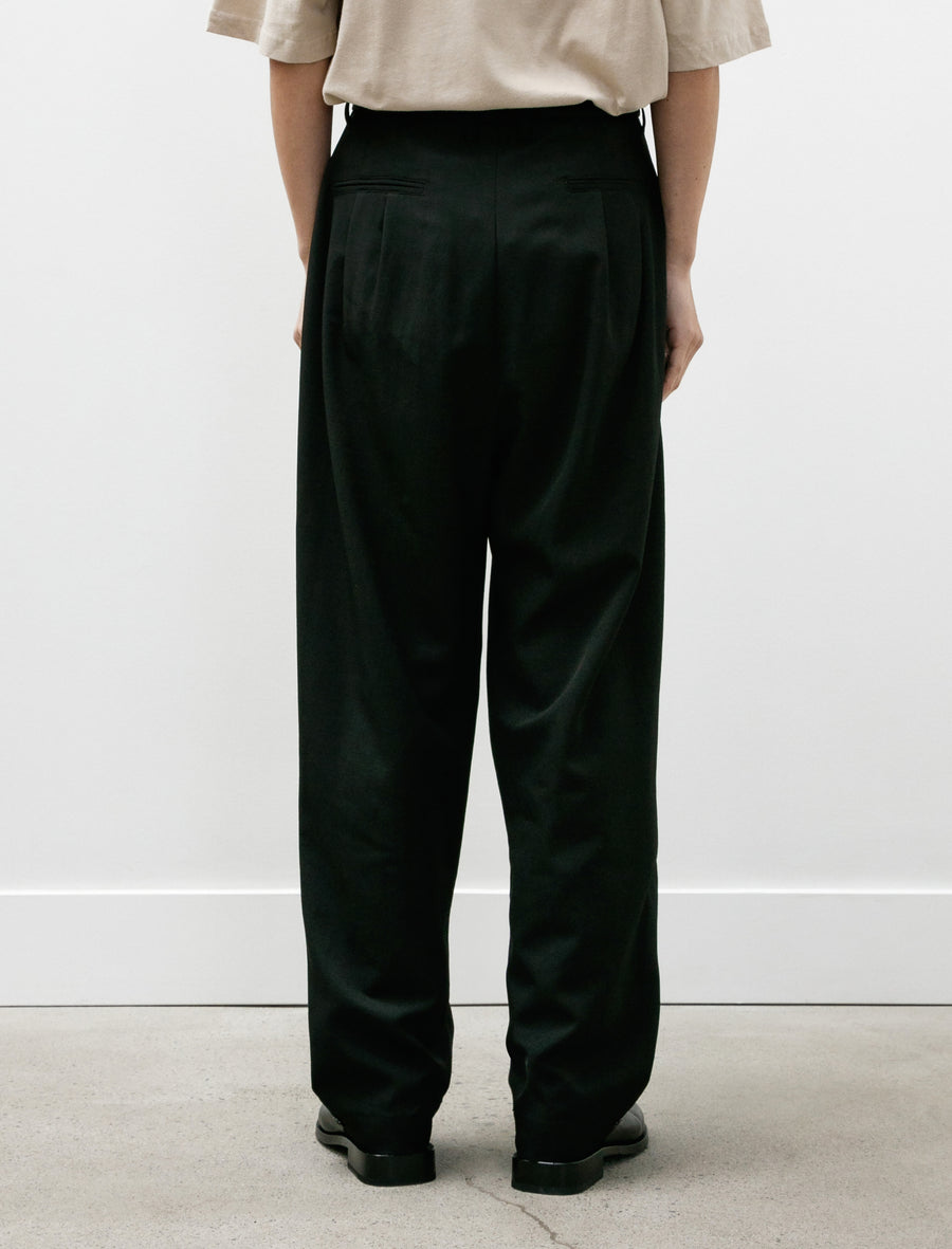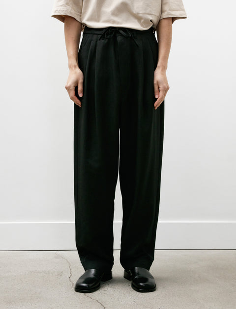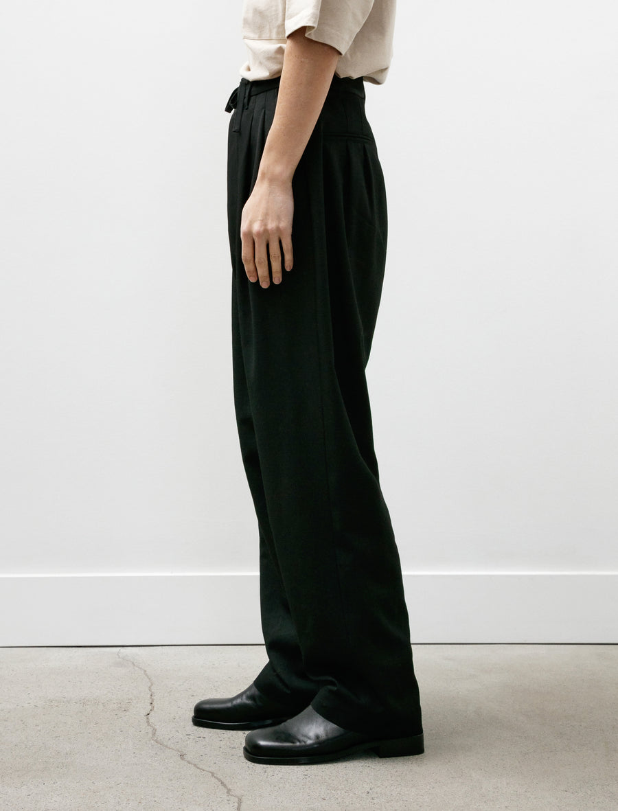 Wide fitting, long-rise, pleated trousers cut from a smooth surfaced wool/viscose gabardine in black with a weighty, bouncy hand feel. Feature a zip fly, a top button closure, an external drawstring at the waist, dual pleats at the front waist, front slash pockets, and rear welt pockets with double darts that expand to subtle pleating below the pocket opening. The volume afforded by the pleats at the front and back creates a generous draped silhouette through the thigh that is controlled with a very slight taper from the knee, producing a sense of dynamic movement from the hips to the ankle. Completed with button-fastening hem cinches at each leg that can be used for further shaping to enhance the draped effect.