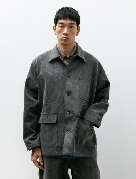A loose fitting work jacket cut from an organic cotton denim dyed using charcoal based sumi ink to a soft medium grey with subtle variation in tone throughout; the fabric bears a pleasing density that is contrasted by a soft, pliable hand. Features a pointed collar, a left breast pocket mirrored by an inner pocket at the right side, and large flap closure pockets at the waist. Bi-swing pleating at the shoulders offers exceptional range of motion while simultaneously adding volume to the back of the silhouette, encouraging movement and highlighting the qualities of the denim. Constructed using fine single needle flat felled seams throughout for a hard wearing finish that is built to last; buttons made from 94% castor bean based polymers, 6% nylon.