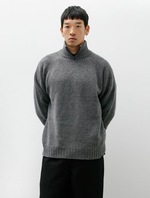 An easy, relaxed fitting, high-neck sweater knit from a super soft, plush merino/cashmere yarn in a medium grey melange. The high neck collar features a Riri zipper, allowing the neck to be opened and laid flat similar to a polo collar. Roomy yet controlled proportions combine with raglan style sleeves for natural drape throughout and a sense of soft elegance. Constructed using seamless, full-fashion methods for a long lasting shape with a smooth, tidy interior.
