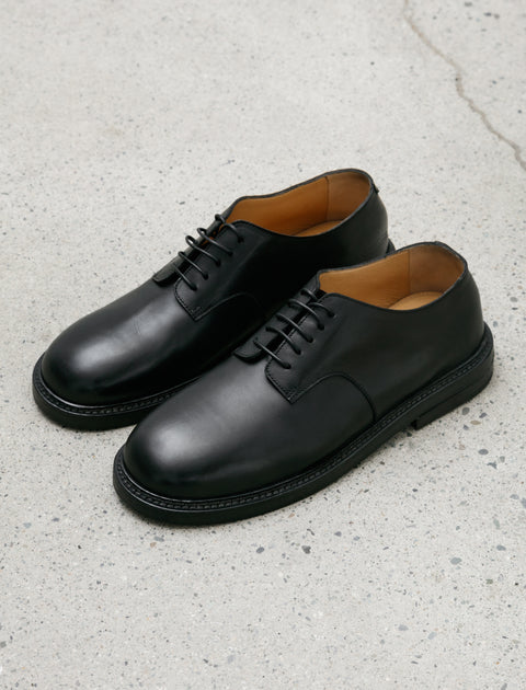 A five eyelet derby shoe cut from a buttery soft smooth leather with a soft shine in a deep black. Features a rounded toe with a straight foot profile lending a silhouette that draws the eye to the forefoot. Waxed laces and a sturdy Norwegian welt construction lend a rugged look that contrasts nicely with the formal feel of the foot profile. Completed with a leather outsole and a leather heel with rubber slip pad; fully lined in natural tan leather.