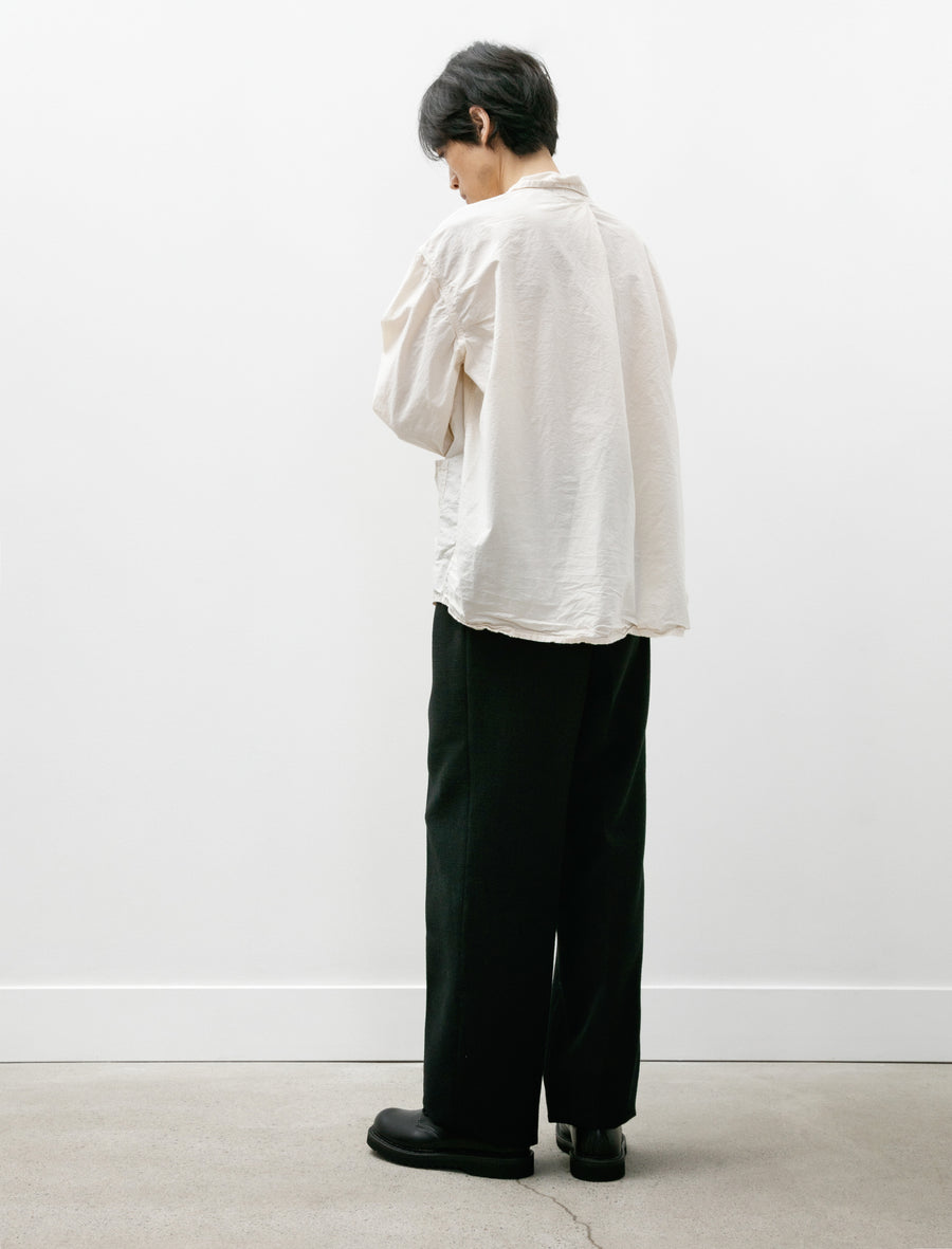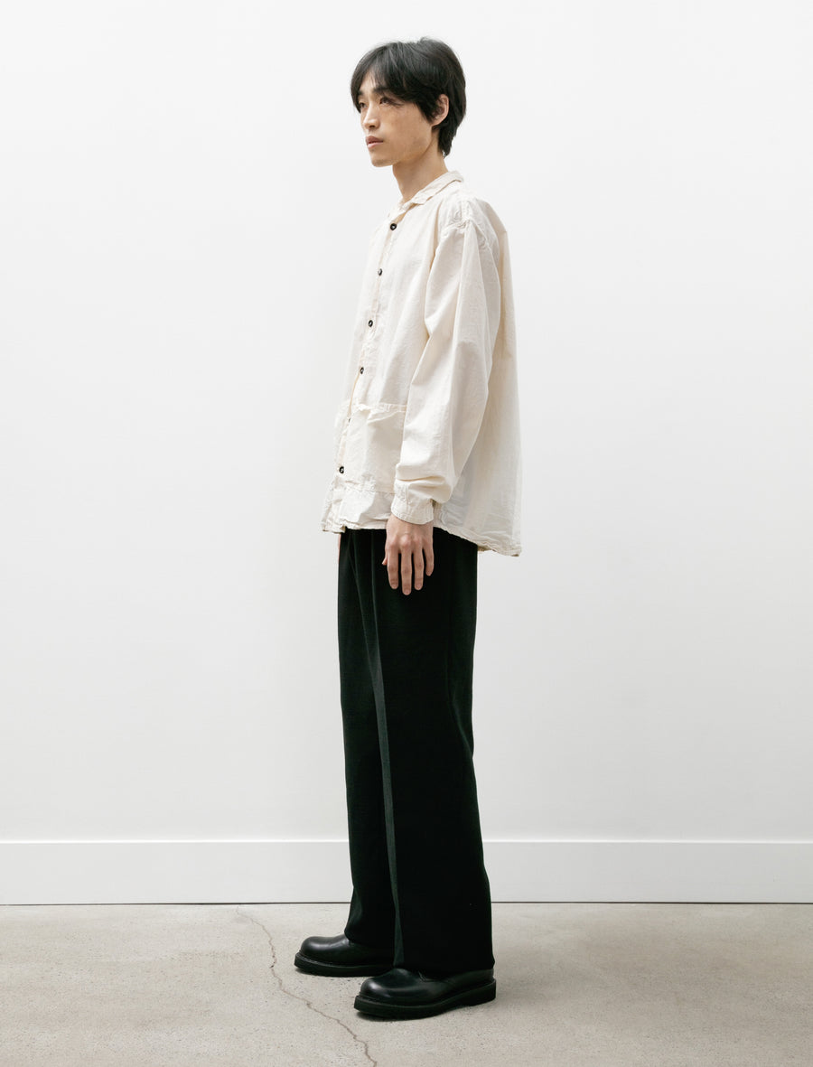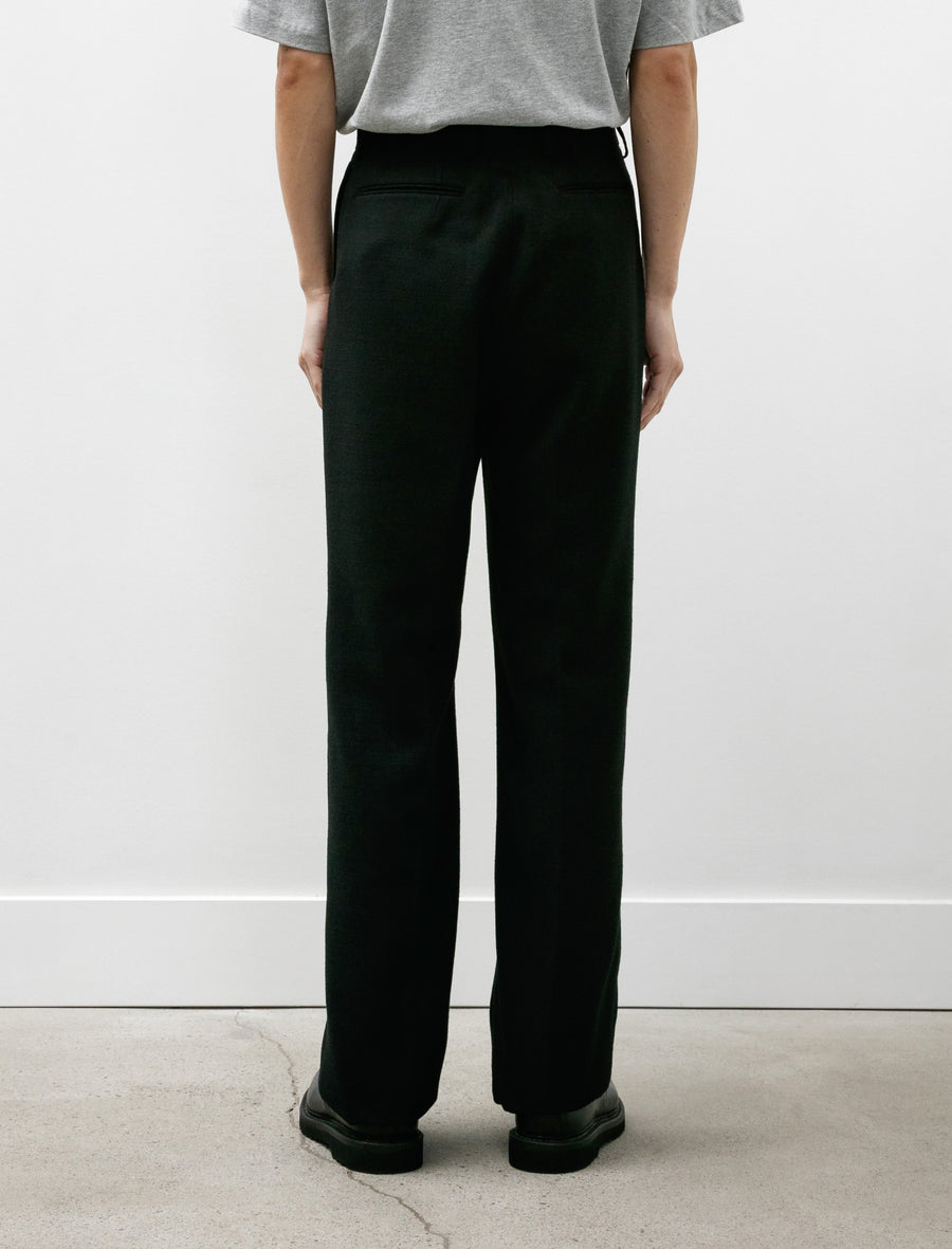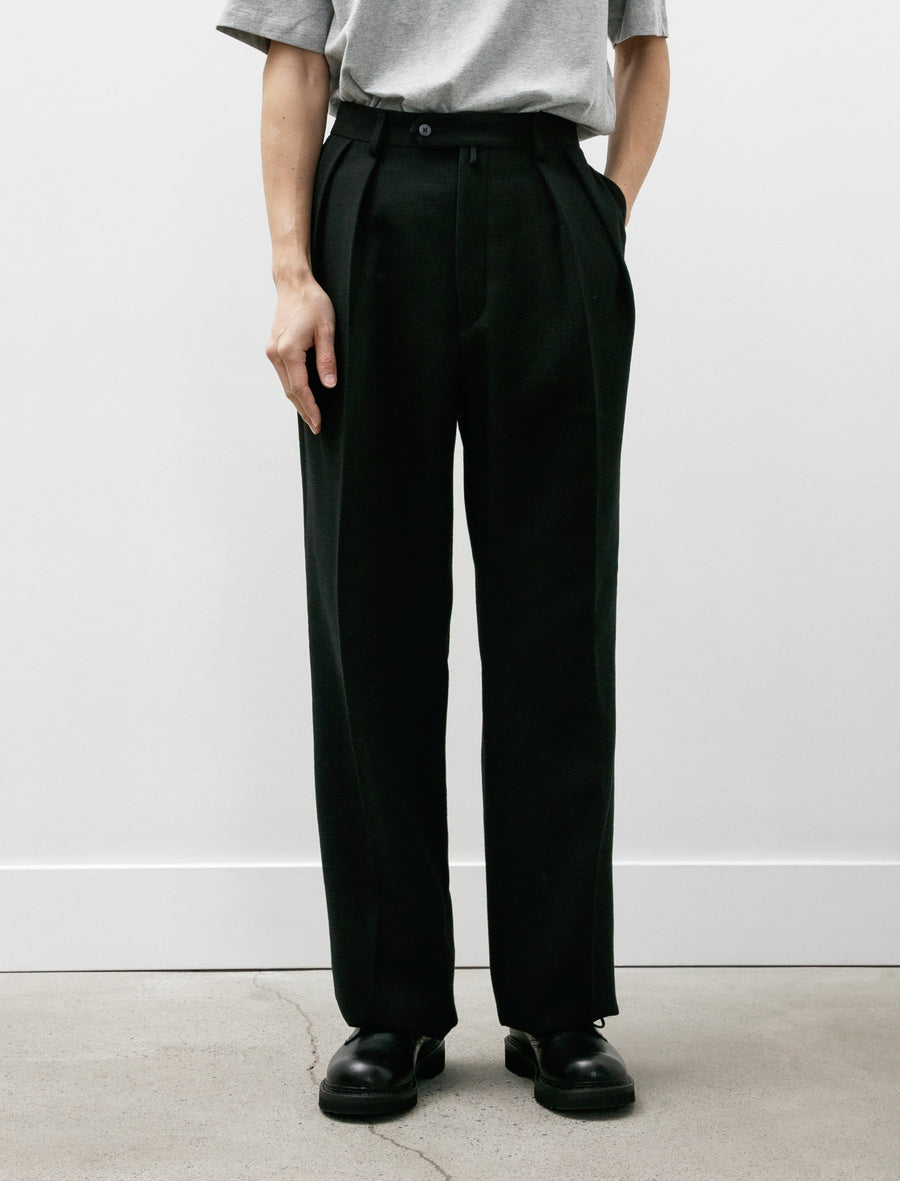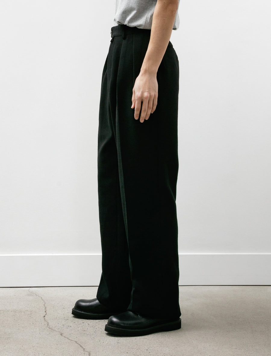 Wide fitting, long rise, tapered trousers cut from an imitation linen, poly canvas in black. Feature a three point closure, a button fly, two pleats at the front waist, front on-seam pockets, and rear welt pockets. Generous proportions through the seat and thigh provided by the pleats are controlled with a gentle taper to the knee, producing a soft draped silhouette that evokes classic tailoring style lines; the imitation linen offers a surprising suppleness that contrasts the more rugged surface texture. Constructed with additional seam allowance through the seat and a split waistband for easy alterations, completed with an unfinished full-length inseam to be hemmed to the desired length; Corozo buttons.