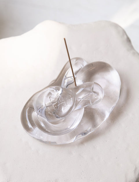 Crafted in the historic Holmegaard Værk glass factory of Denmark, this incense holder is handmade by pouring molten glass on a cold steel surface resulting in a layered mass of ribbon like glass. A small indent has been pressed in to accommodate incense sticks, finished with a NIKO JUNE stamp. Brought to you in an icy clear colour, each piece is slightly different.