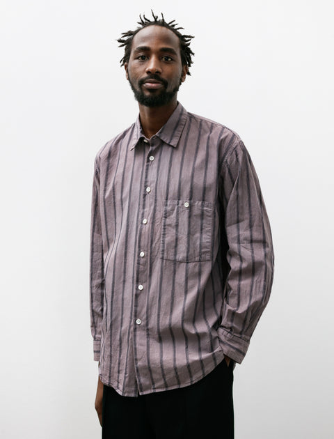 A generous, relaxed fitting, button front shirt cut from a striped, crisp, Italian cotton poplin that has been garment dyed, by hand, using anthracite charcoal. Features a classic collar, a lined left breast pocket with mitred corners, and a clean finished rear yoke with a soft muslin internal panel for improved comfort. Cut with a generous body and a tailored armhole that provides excellent ease of wear without the need for excessive bulk at the sides; a curved hem and easy proportions combine with the character of the fabric to allow for crisp airy drape throughout. Constructed using fine single needle flat felled seams throughout for a fully encased finish; completed with hand sewn buttonholes, hand stitched vintage shell buttons with hand shanked attachments.