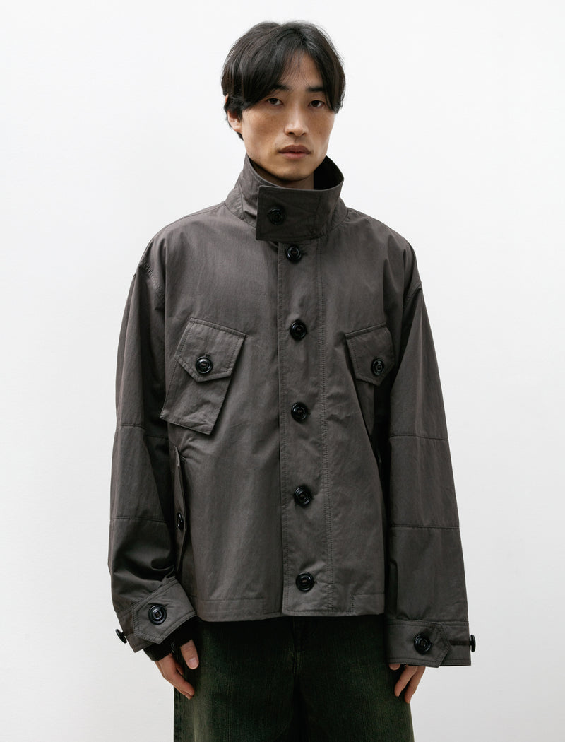 This lightweight Mac is cut from highly dense shirting fabric, made with a relaxed fit almost like a lab coat. The coat is unlined, minimal in nature with covered button placket, simple stretch cuffs and single rear vent. Jetted pockets at the hip.