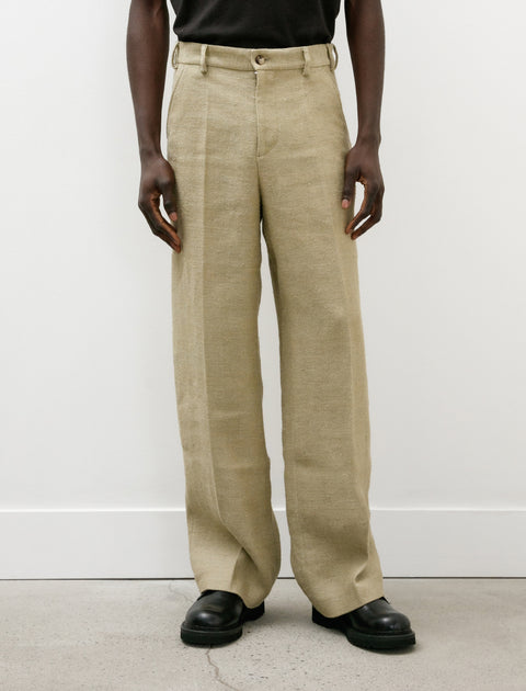 Wide fitting straight legged trousers cut from a slubby linen/silk canvas with a rich textured surface in a natural oat beige. Feature a two-point closure, a zip fly, front slash pockets, rear welt pockets, and a lightly elasticated panel at the back waist. Balancing form and function, the generous straight leg produces a column-like silhouette that sits slightly away from the leg when combined with the subtle structure created by the full-length crease. Constructed with rolled seam allowances through the seat and blind hems for an elegant finish; horn buttons.