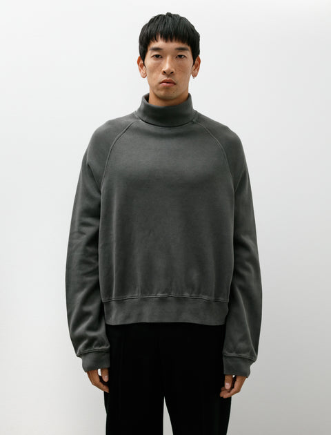 A relaxed fitting, cropped, pullover long sleeve cut from a heavy, dry, fine cotton rib jersey in a faded pigment black. Raglan sleeves maintain mobility while reducing bulk around the shoulder, combining with the rollneck for a sense of timeless athletic ease. Constructed cover stitched reinforcements to reduce inner bulk and improve durability.